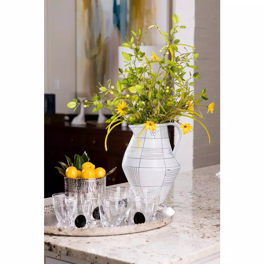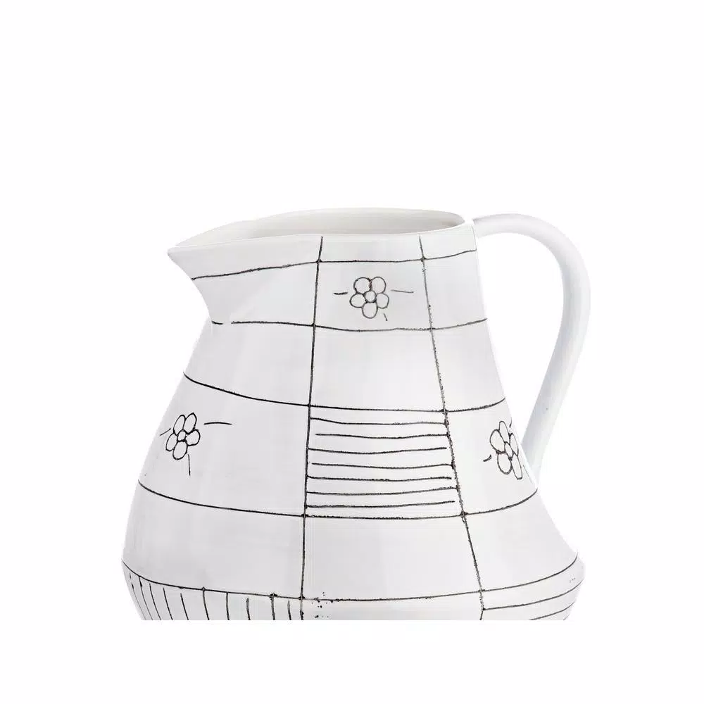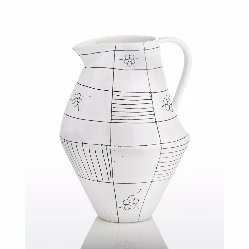 Interesting ceramic piece, hand-molded and seared in a graffiti style while the clay is still wet. The incised design is highlighted in black. Made in Portugal. An artistic pitcher that adds to any decor.