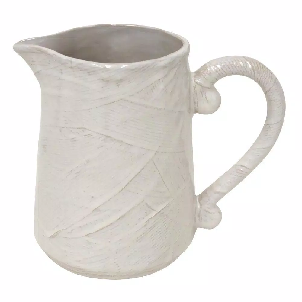 This pitcher features a textured finish. It is achieved by imprinting a gauze type fabric into the formed ceramic plate before it is fired. This quaint pitcher is the finishing touch on your picnic lunch table.