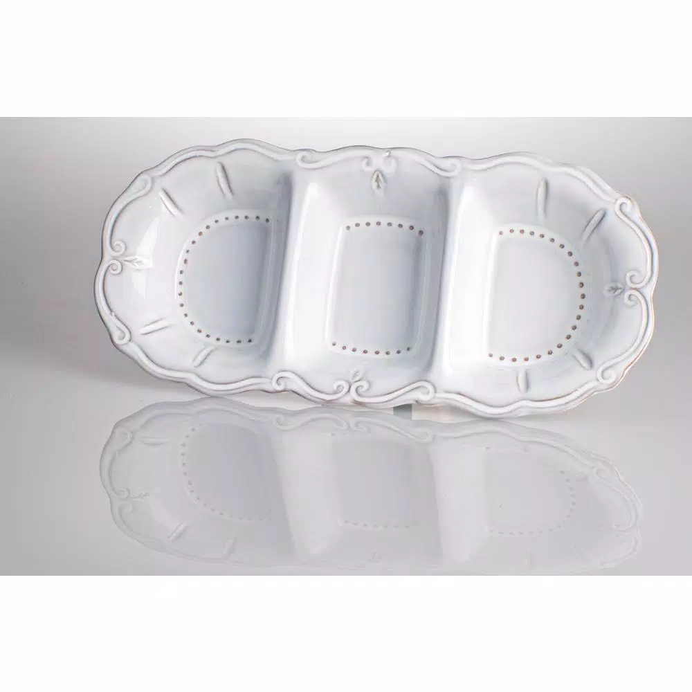 Handmade in Portugal, this is one of the most useful items ever. Colorful vegetables look absolutely beautiful in this handsome dish. How about condiments for a special dinner. A nice incised design completes this all white dish.