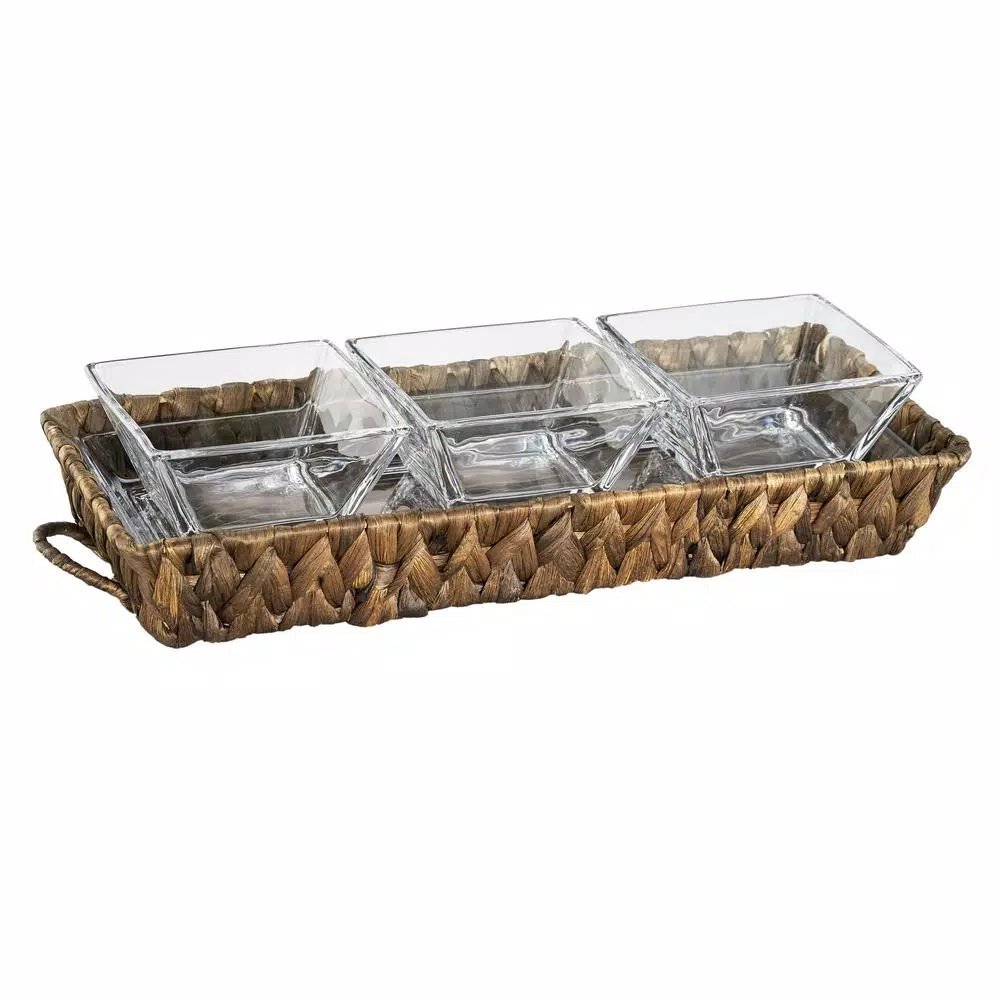 Artland Garden Terrace 5pc set Sectional Server. The set contains 1-Glass Tray 12.25โณL, 5โณW, 1โณH. 3-Sq. Glass Bowls 3.75โณ and a Water Hyacinth Holder. with Handles 13.25โณL x 5.75โณW x 2โณH.