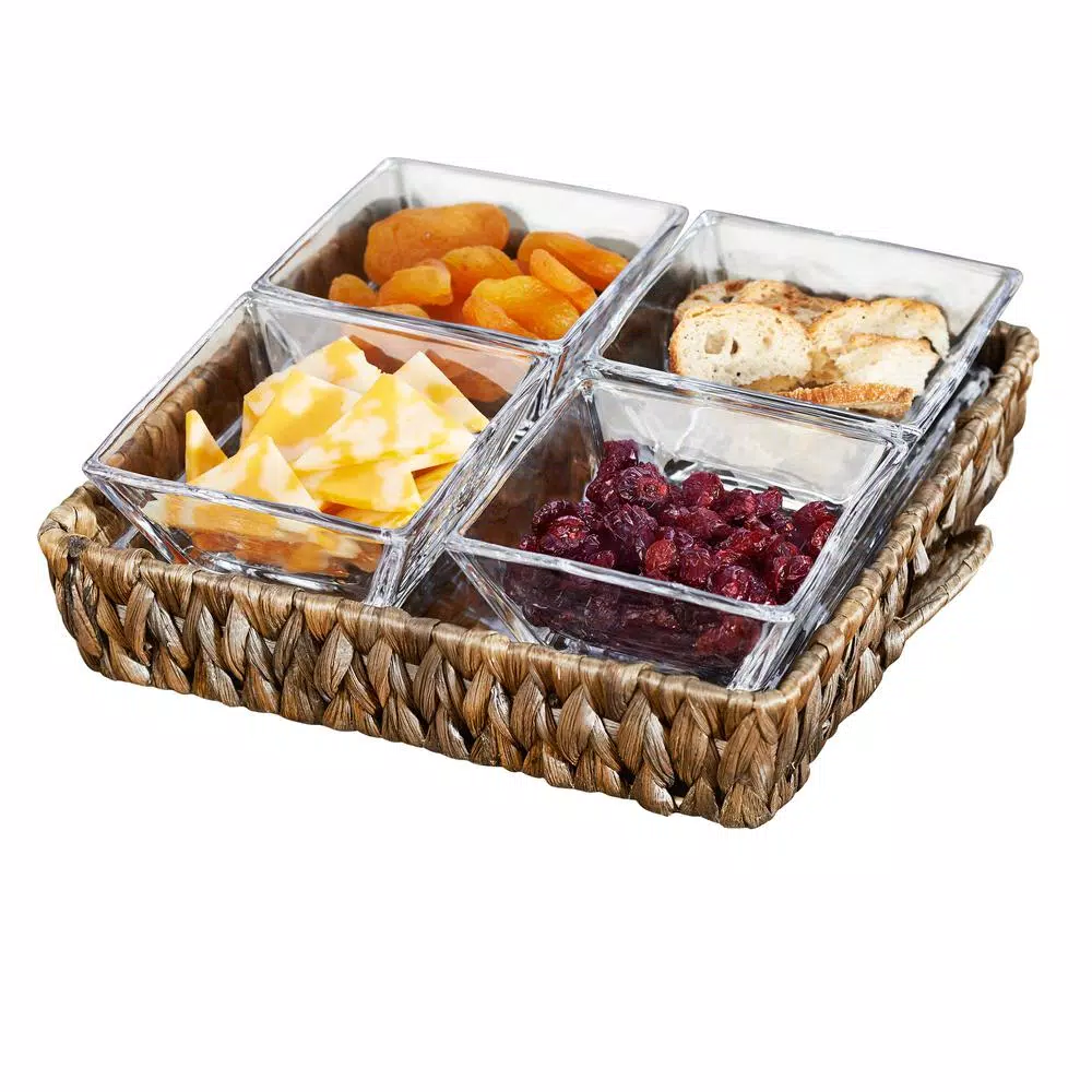 The Artland Garden Terrace 4 Sectional Server is made of Hand Woven Water Hyacinth. It comes with 1- Sq.Glass Tray 7.75″,1″H, and 4-Sq. Glass Bowls 3.75″, and a Water Hyacinth Holder 8.5″sq x 1.5″H.