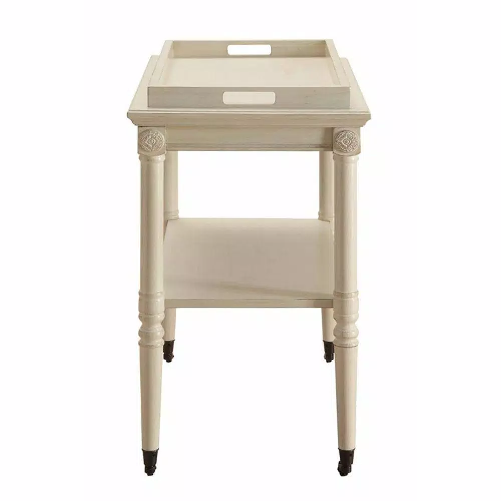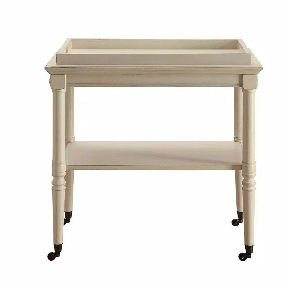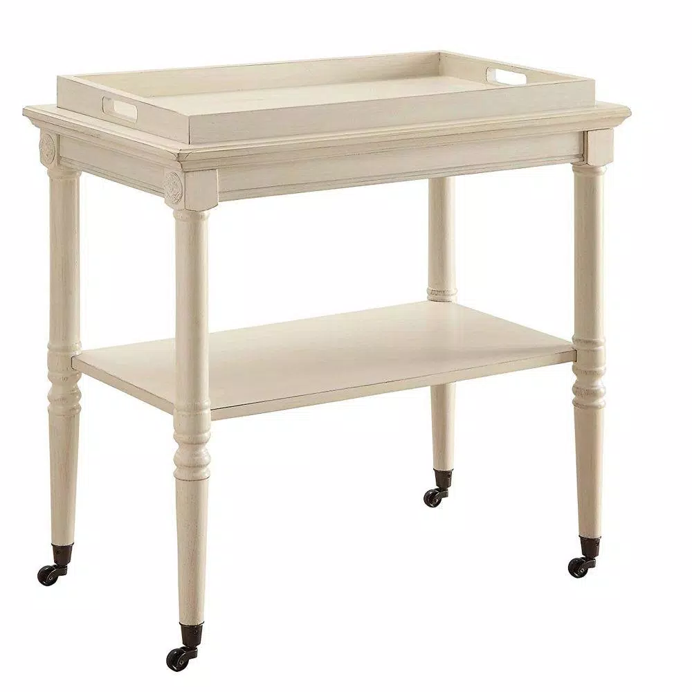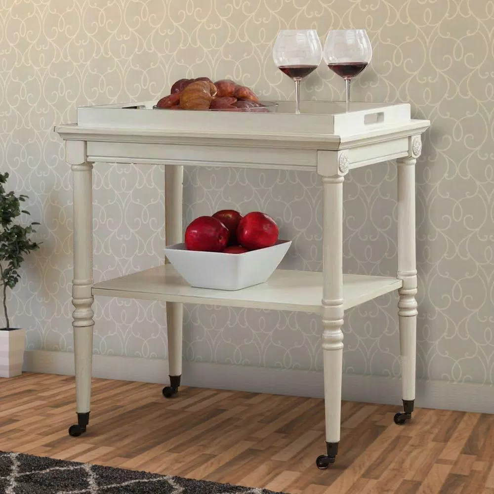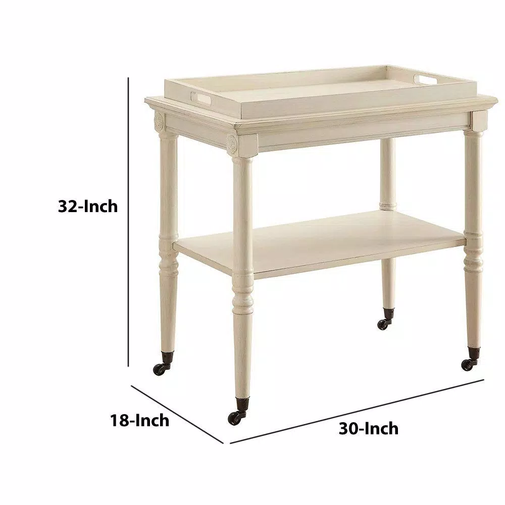 Provide mobility to your scrumptious meals by incorporating this transitional style Kitchen Cart which comes with 2 tier storage space and rests on casters for mobility. Constructed sturdily from solid wood. It is accented with antique white finish.