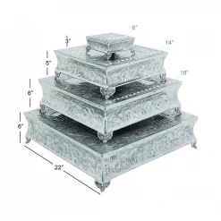 Beautiful en-carved wedding cake stand with hammered center makes a prominent and great inclusion to your kitchen and dining spaces. It is made of aluminum and features a shinny gold finish, giving this cake stand an imperial look. The unique style of this cake stand, compliments cakes of different shapes and sizes. You can even use this stand for showcasing wedding cake, birthday cake or for any theme party.
