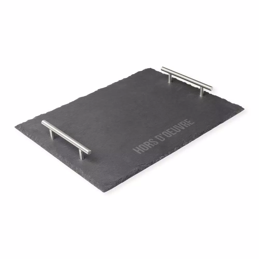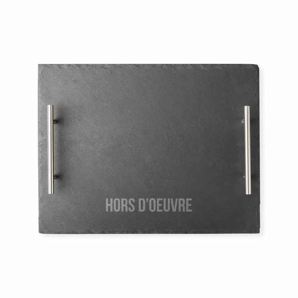 Master the art of entertaining with the Hors d’oeuvre slate tray with metal handles. The slate features a natural edge and a modern engraved design. This product features sturdy food safe slate and metal handles for easy carrying. Impress your guests with this contemporary take on a hosting staple.
