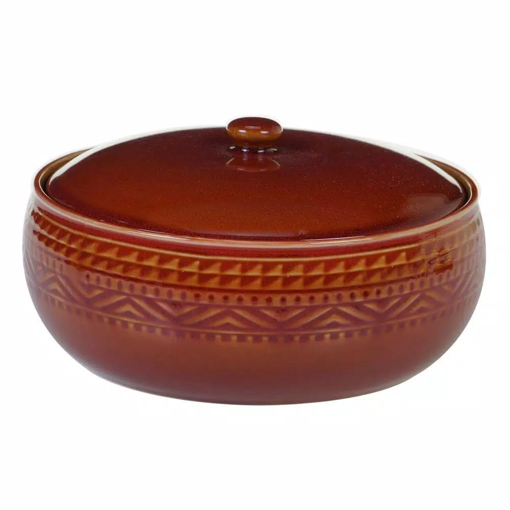 Embossed with traditional designs and glazed in rich reactive colors, Certified International s Aztec ceramic dinnerware and serveware make dining and entertaining fun . Designed by Nancy Green, each item is available in 3 different glaze colors, brown, rust and teal, offering exciting ways to mix and match for a colorful table. These collections include unique pieces such as a covered bean pot which is perfect for serving your favorite Mexican dish.