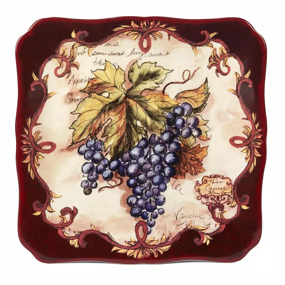 Enjoy a glass of wine while dining, serving or entertaining with Certified Internationals Vintners Journal. Ceramic dinnerware and serveware designed by Tre Sorelle Studios. Sophisticated scenes of wine bottles, wine glasses and grapes are highlighted against backgrounds of vintners notes.