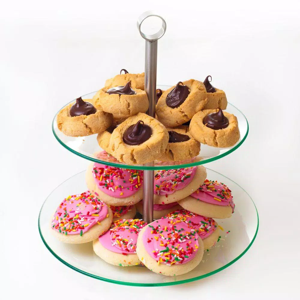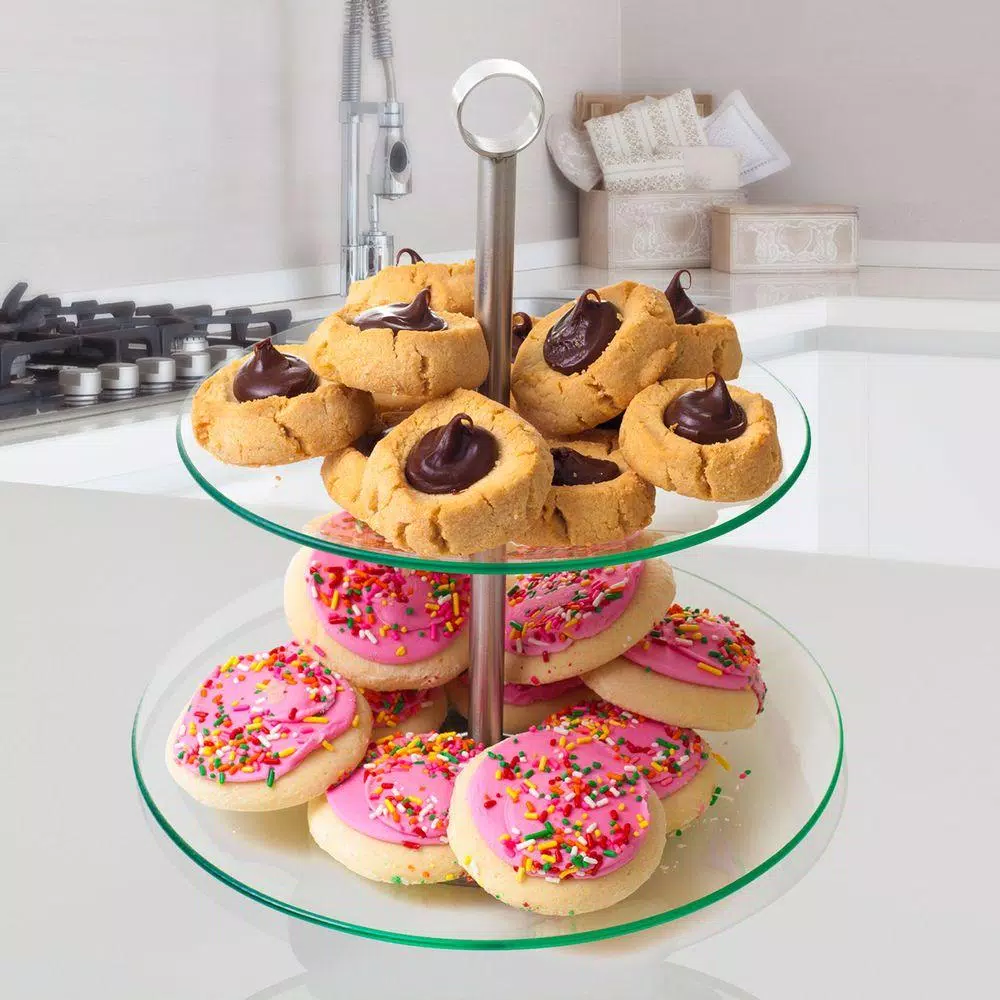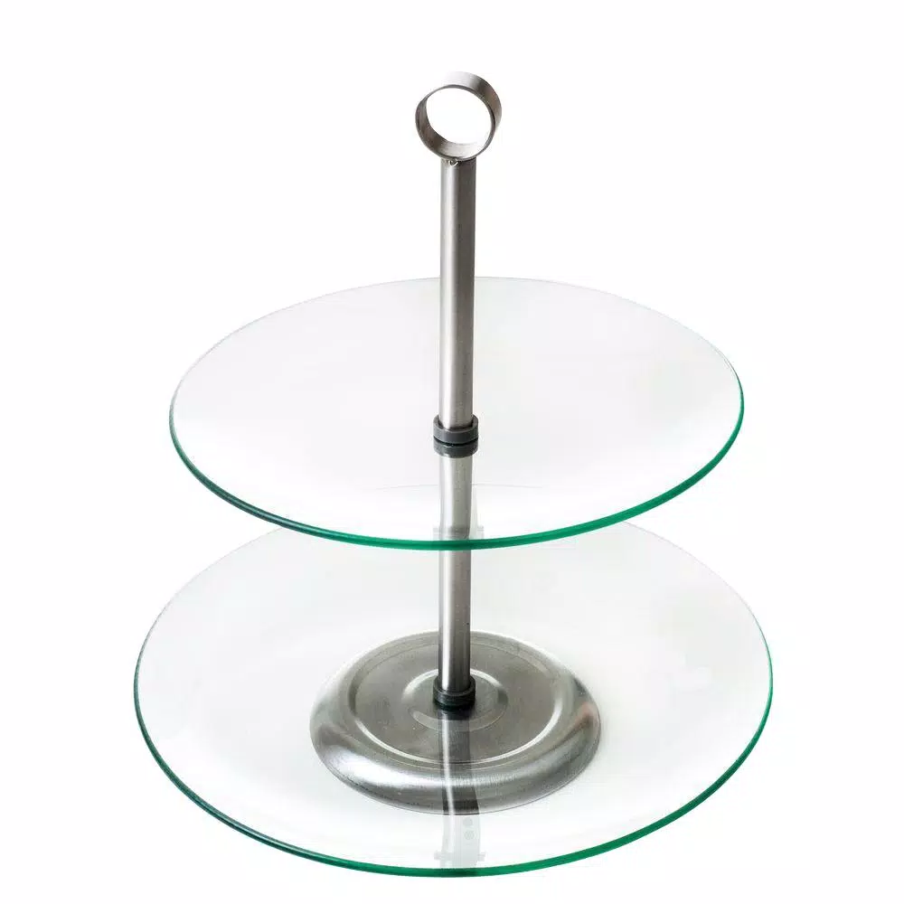 Display your desserts and appetizers with the 2 Tier Round Glass Buffet and Dessert Stand from Chef Buddy. Beautifully display your desserts and appetizers. This Chef Buddy 2 Tier Round Glass Buffet and Dessert Stand will take your desserts and more to a whole different level. Perfect for cupcakes, brownies, cookies, even veggies and dip. Adorn with flowers and the dessert stand becomes a beautiful center piece. Stainless steel base prevents bottom glass from getting scratched.