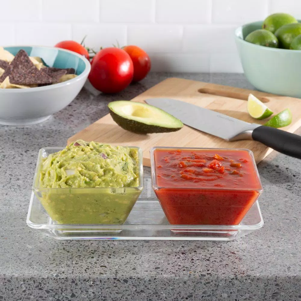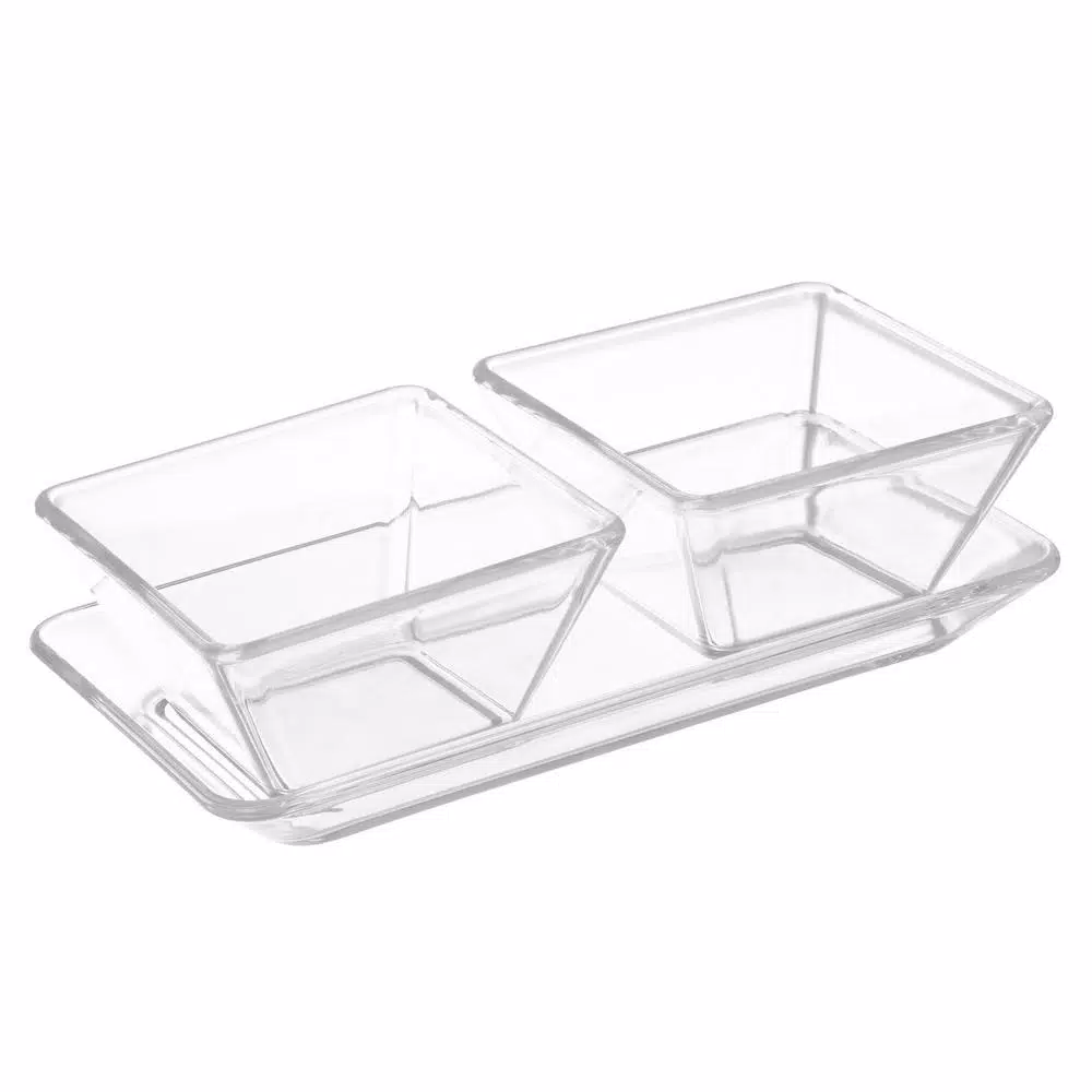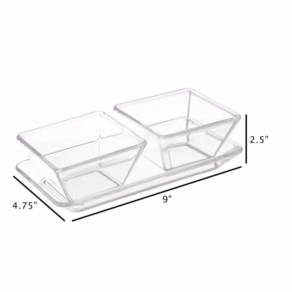 The 2-Dish Serving Tray Set by Classic Cuisine is a convenient and easy way to serve condiments, snacks or appetizers at your next party. With 2 separate bowls that hold up to 10 oz. each, you can easily display nuts, veggies, fruit, drink garnishes, dips, dressings, chips, salsa, guacamole or any other condiments during your event. The shatter-resistant and BPA free crystal-clear dishes also come with a tray, so you can carry all the bowls at once. Great for both indoors or outdoors, this stylish and practical serving bowl set is a must have for your table, buffet, or bar at your next barbecue, baby shower, or birthday party.