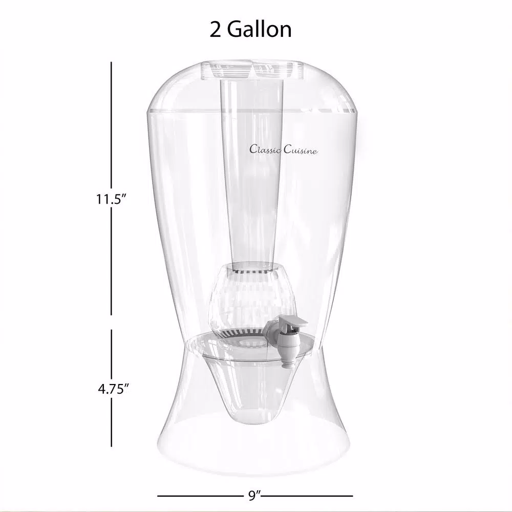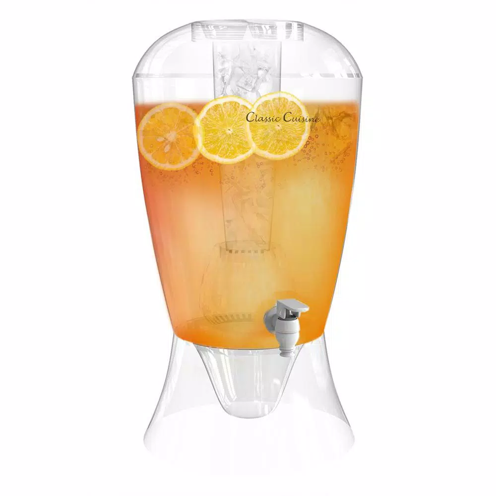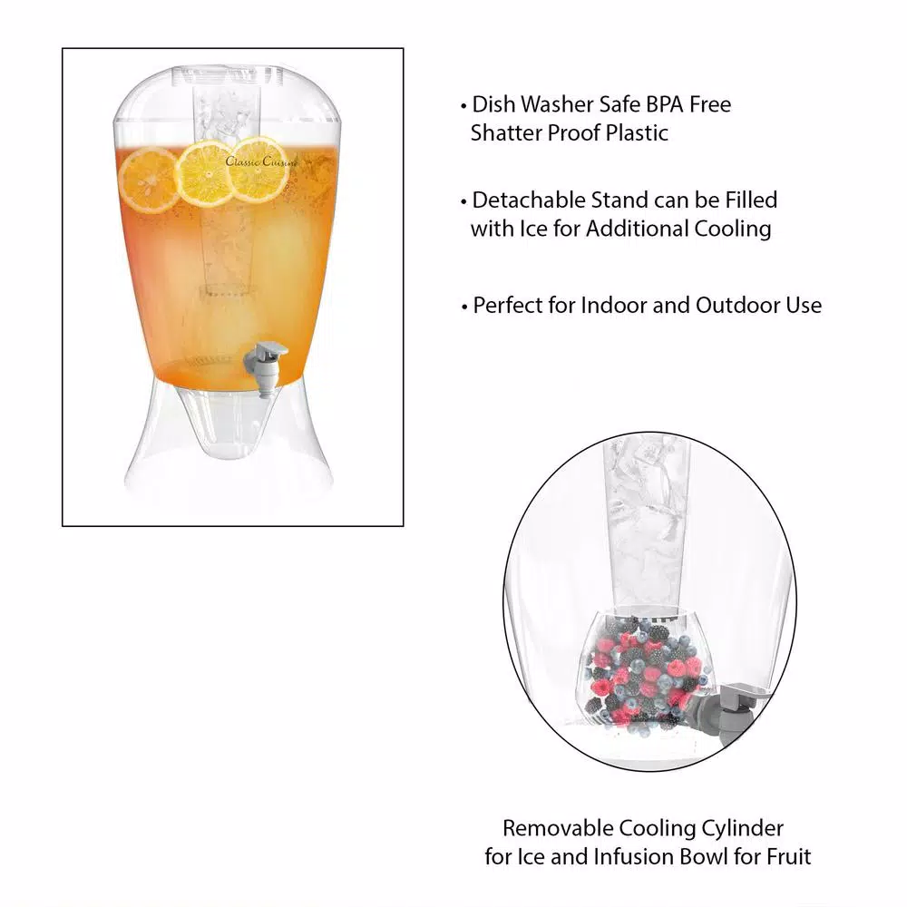 The 8 Qt. BPA Free Shatter Proof Beverage Dispenser by Classic Cuisine is a convenient and easy way to serve drinks at you are next party. With a cooling cylinder for ice, as well as a detachable stand that can also be filled with ice for additional coldness, the beverage inside will stay nicely chilled during you are event. The shatterproof and BPA free drink dispenser also comes with an infusion bowl, so you can easily add natural fruit flavor to you are water, lemonade, tea, sangria or punch.