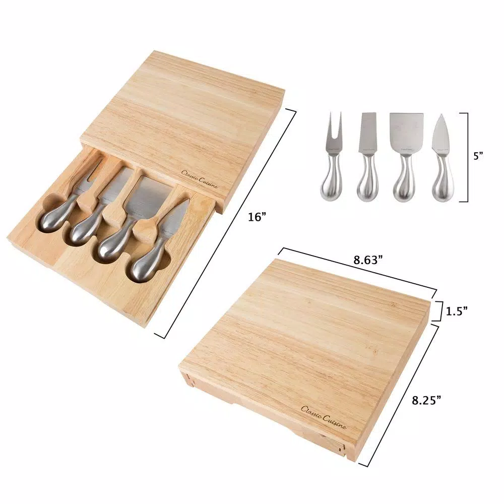 The Classic Cuisine Cheese Board set is perfect for serving cheese, meats, spreads and other fine foods. The set includes 4-stainless steel essential cheese serving tools and a self-contained storage drawer. Great for entertaining, picnics, charcuterie and wine and cheese parties.