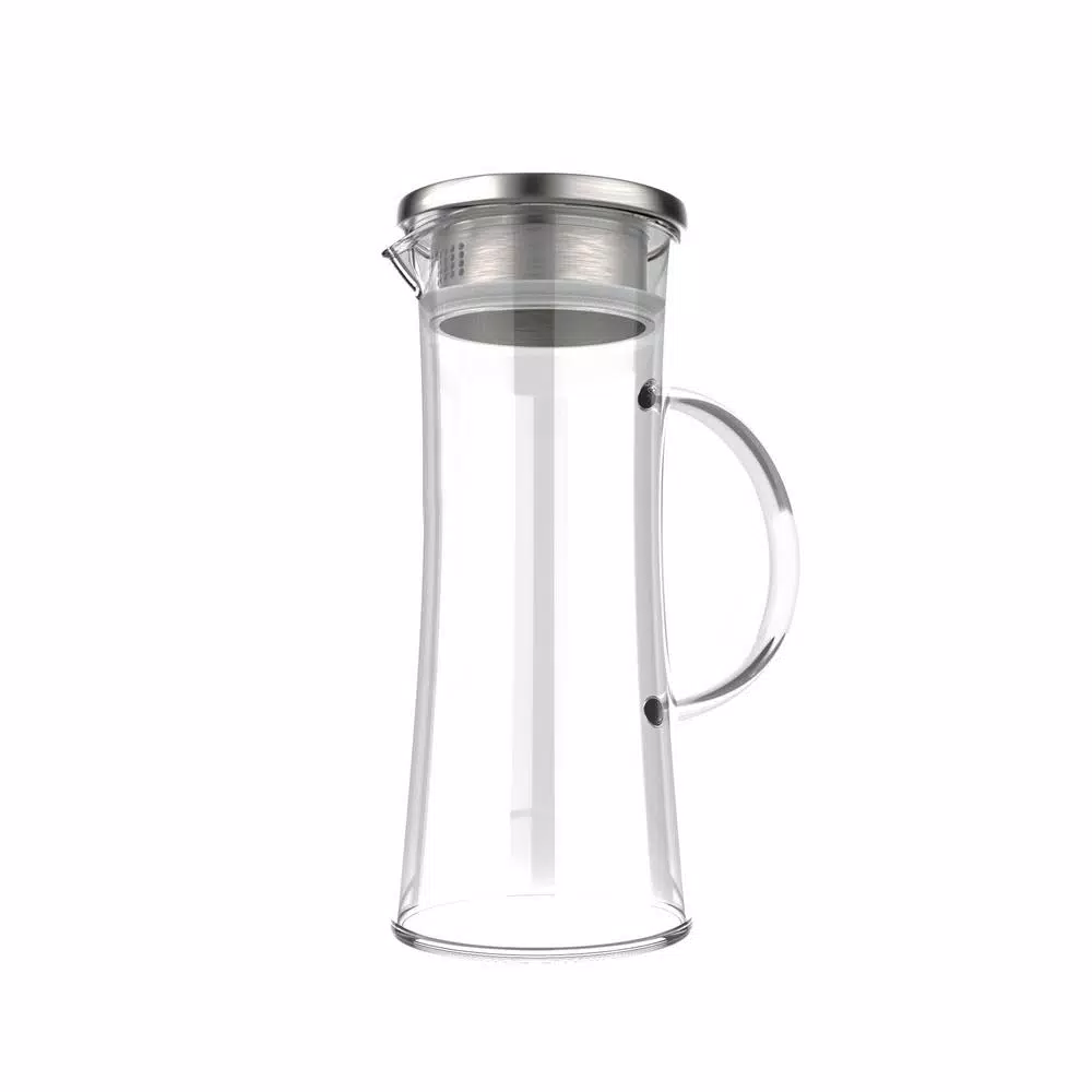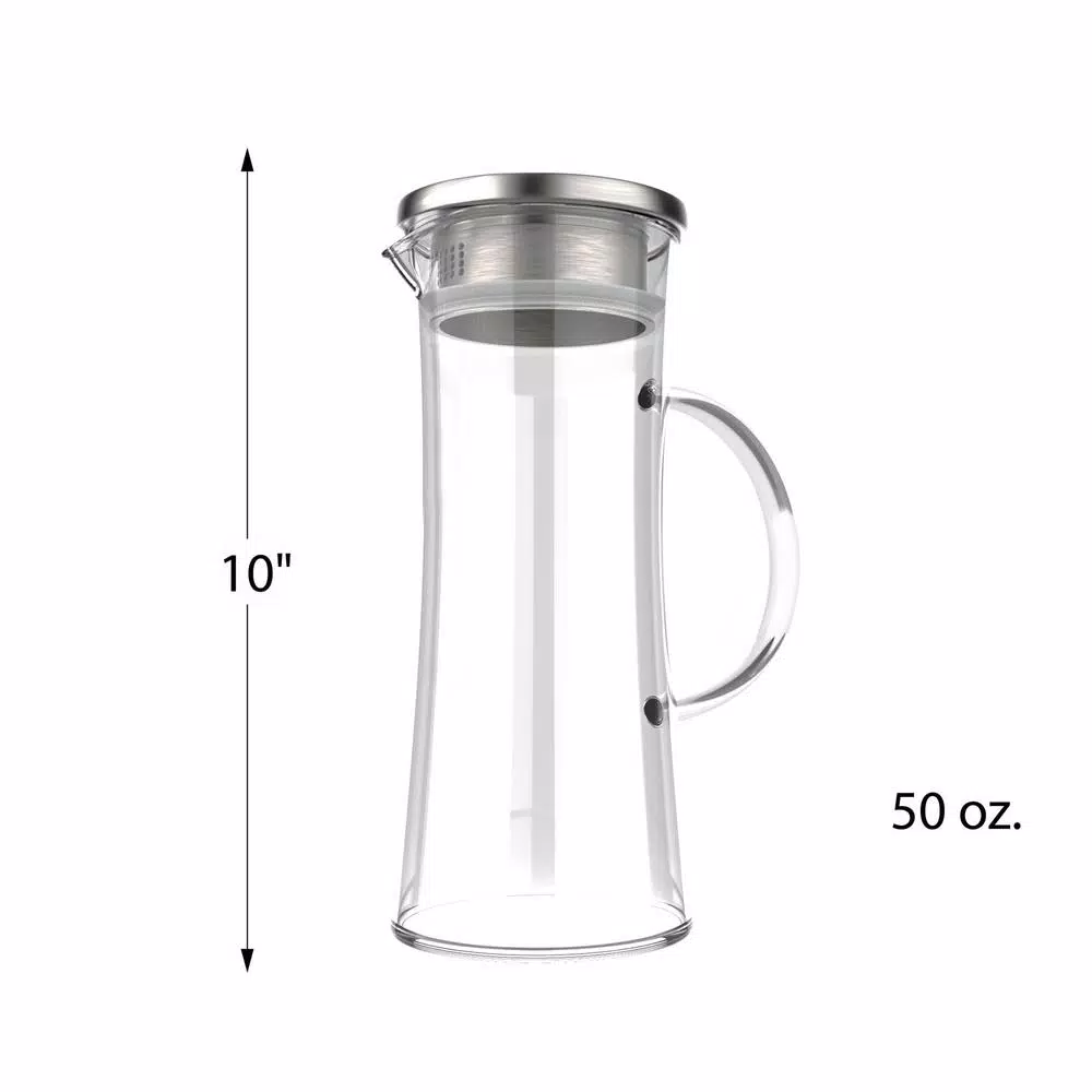 The 50 oz. Glass Pitcher by Classic Cuisine is an elegant yet practical option for serving your favorite beverages. This carafe is ideal for serving hot or cold drinks, including coffee, tea, punch, or juice. The leak-proof, stainless-steel filter lid has two pour spouts that make it easy to control how much fruit or ice comes out of the pitcher as you pour your infused water or sangria. Its an attractive serving piece to use at your next birthday party, wedding shower, barbecue, or event, while also being sturdy and functional for everyday use.