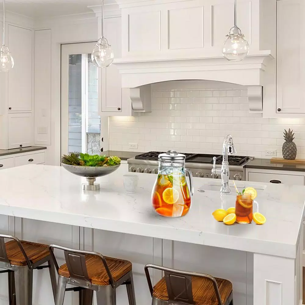 The 64 oz. Glass Pitcher by Classic Cuisine is an elegant yet practical option for serving your favorite beverages. This carafe is ideal for serving hot or cold drinks, including coffee, tea, punch, or juice. The stainless-steel filter lid makes it easy to pour infused water or sangria without the ice or fruit falling out of the pitcher. Its an attractive serving piece to use at your next birthday party, wedding shower, barbecue, or event, while also being sturdy and functional for everyday use.