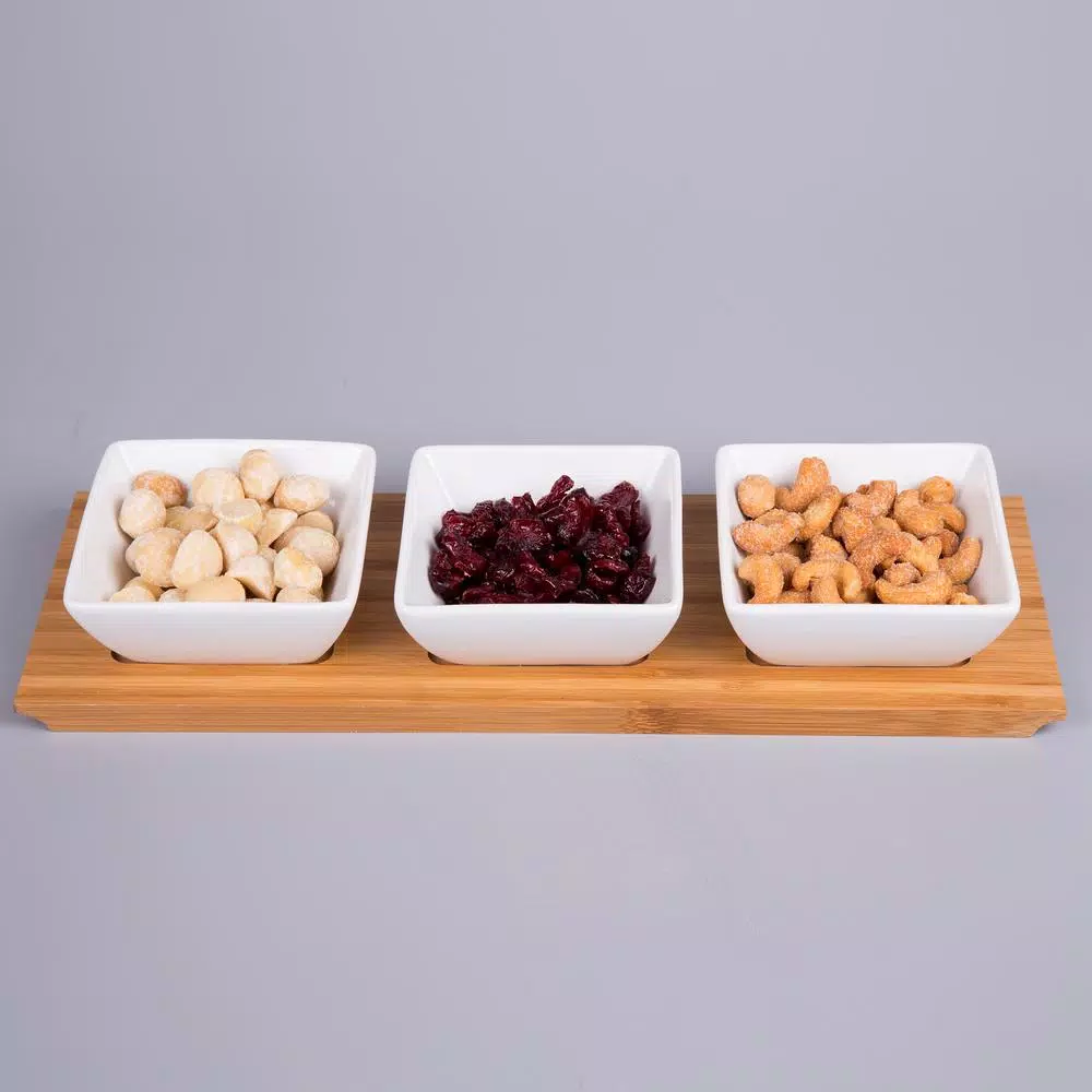 Set includes 3-stoneware square bowls and 1-natural bamboo serving tray. Overall size: 13-3/8 in. x 4-3/4 in. x 2 in. H; bowl size: 3-3/4 in. x 3-3/4 in. x 1-5/8 in. H; board size: 13-3/8 in. x 4-3/4 in. x 1/2 in. H. Fabulous design, perfect for serving snacks, appetizers or use for dips, sauces, condiments and toppings. Perfect for any occasion. Also makes a thoughtful housewarming, bridal shower or birthday gift. Fresh and natural appearance. Stoneware bowls are dishwasher safe. Bamboo serving tray is hand wash only, wipe clean.