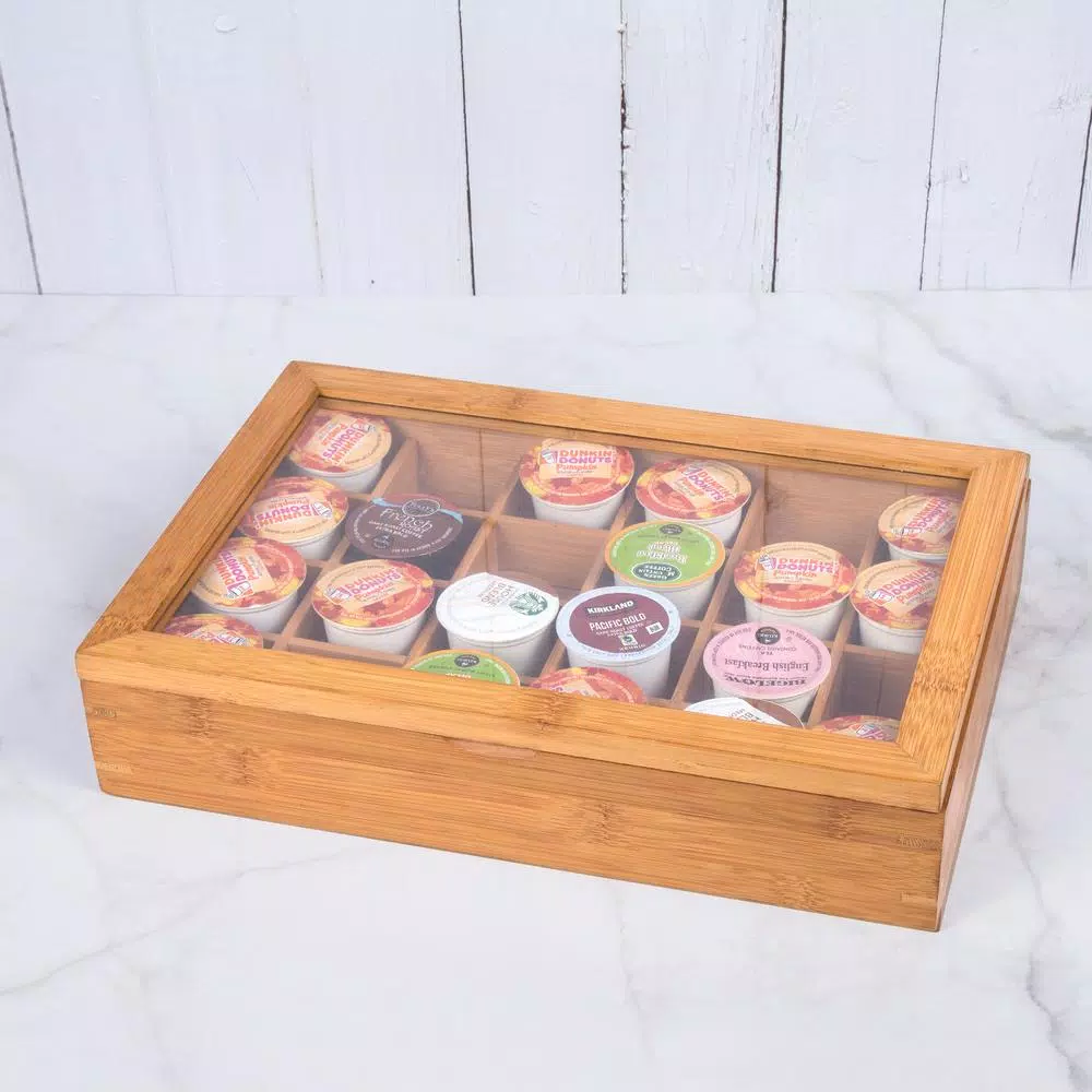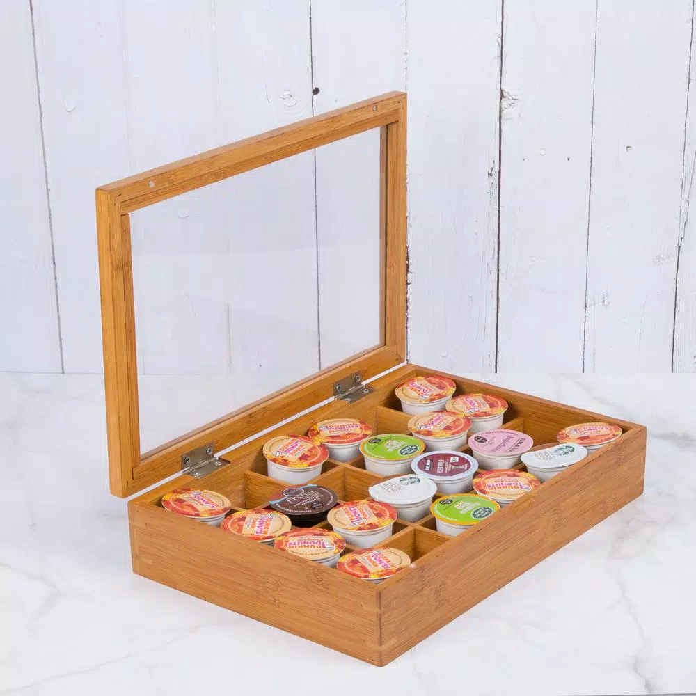 Creative Home single server coffee pod cabinet features a beautiful bamboo base and an acrylic see through lid. This cabinet holds up to 24-flavored coffee pods. Clear lid allows for easy identification of flavored pods at your fingertips.