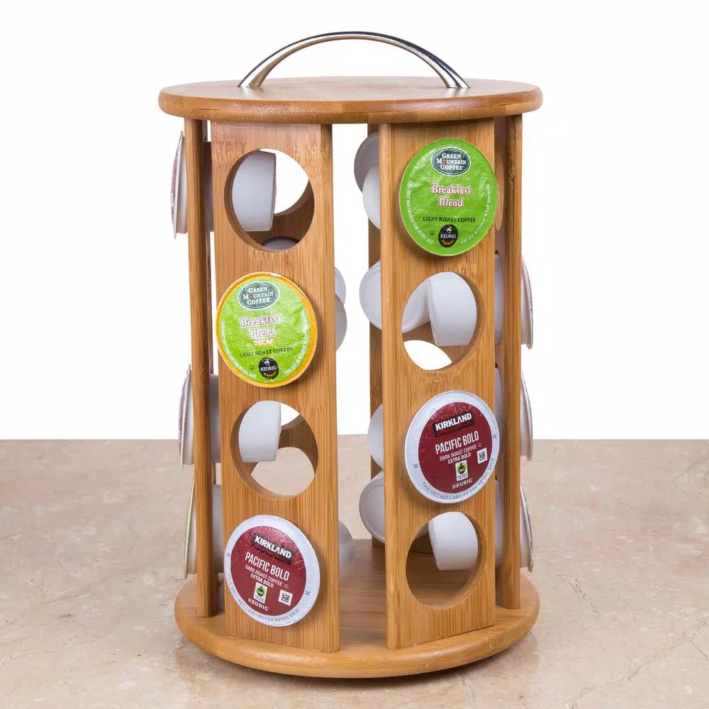 Creative Home revolving single server coffee pod carousel holds up to 24-flavored coffee pods. Have your favorite flavor at your fingertips right next to your coffee maker. Sleek top handle for easy rotation. Made of renewable bamboo.