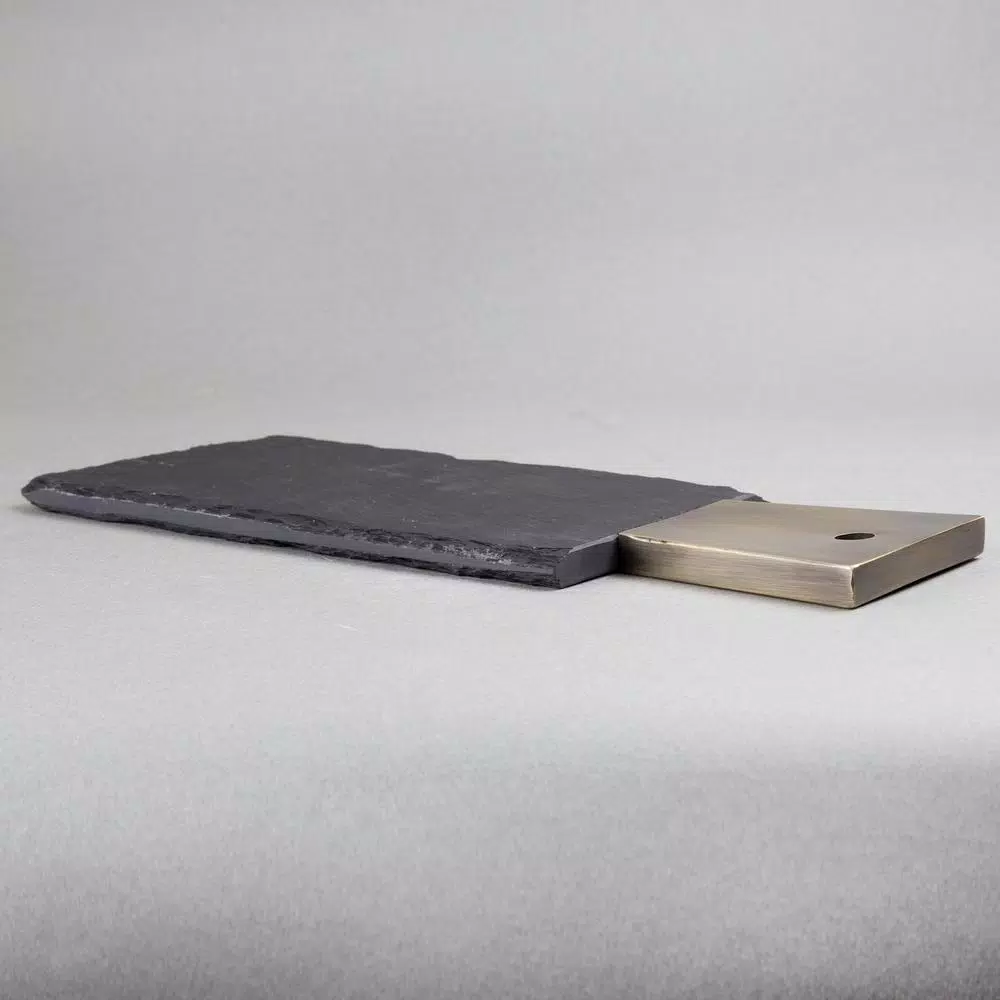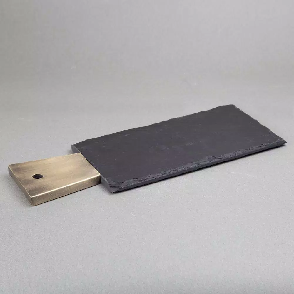 Dimensions: 13 in. x 5 in. x Β½ in. H. Rustic slate, natural stone. Hand-cut natural stone. Timeless, classic design for any home decor. Smooth surface but natural edges slate cheese board, serving board. Easy to clean. Wipe down with mild kitchen cleaner and a damp cloth. Do not wash in dishwasher.