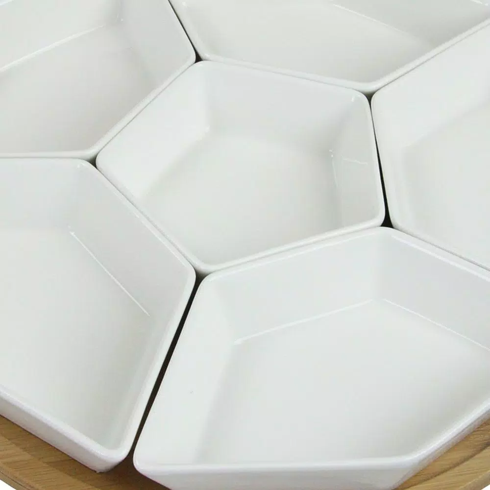 - Set includes: five 7 oz. serving bowls, one 5 oz. center serving bowl and 1 bamboo tray