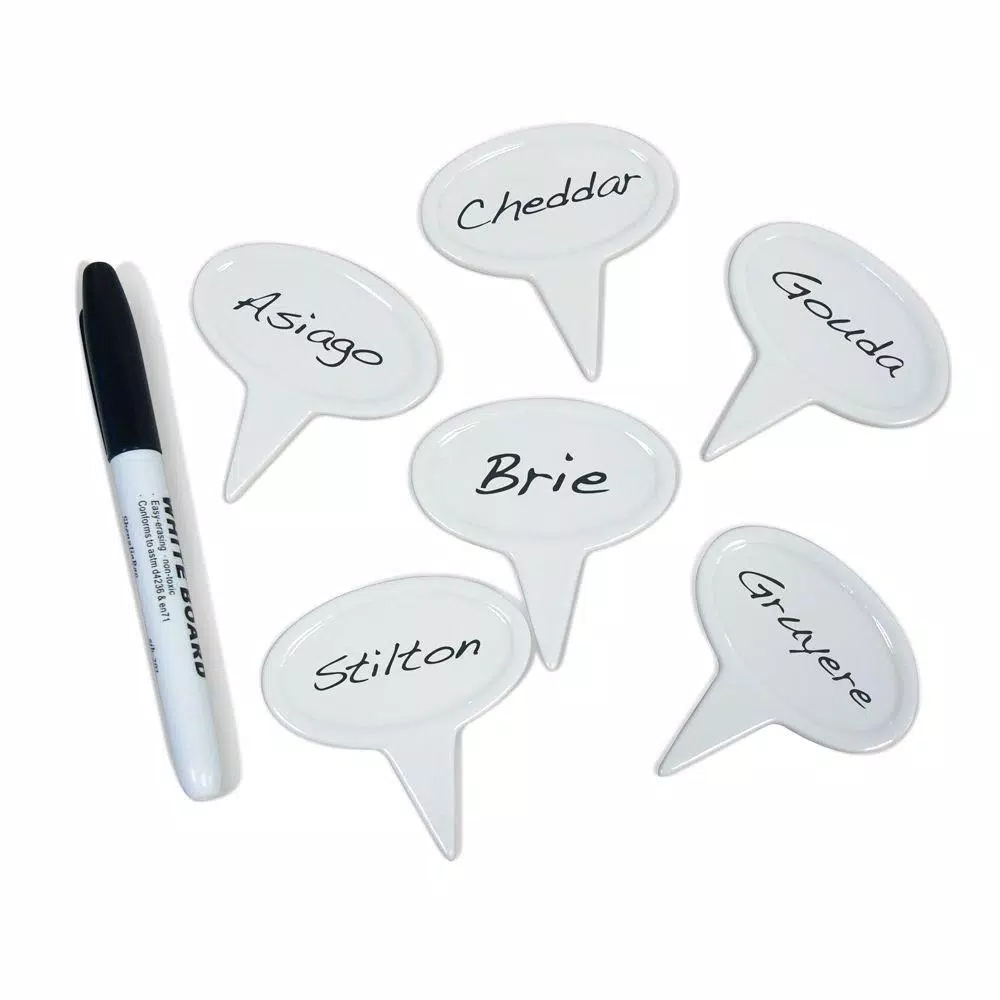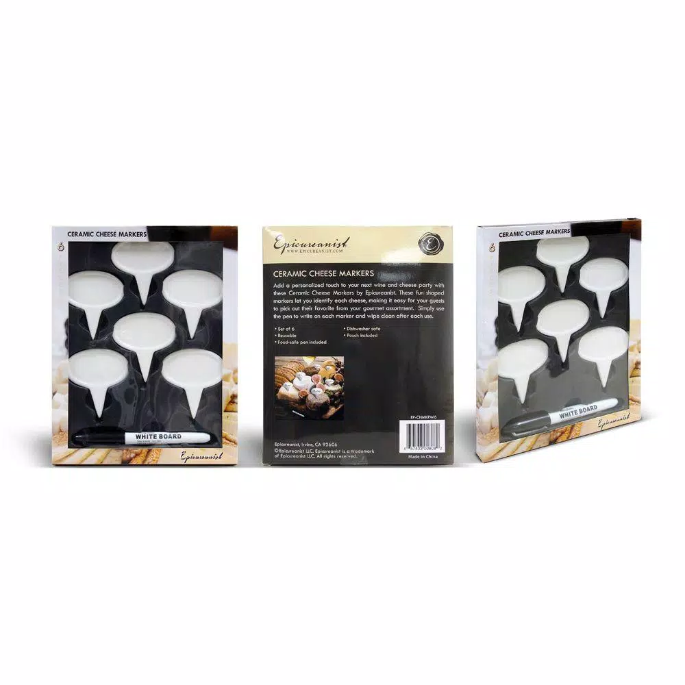 Add a personalized touch to your next wine and cheese party with these Ceramic Cheese Markers by Epicureanist. These fun shaped markers let you identify each cheese, making it easy for your guests to pick out their favorite from your gourmet assortment. Simply use the pen to write on each marker and wipe clean after each use.