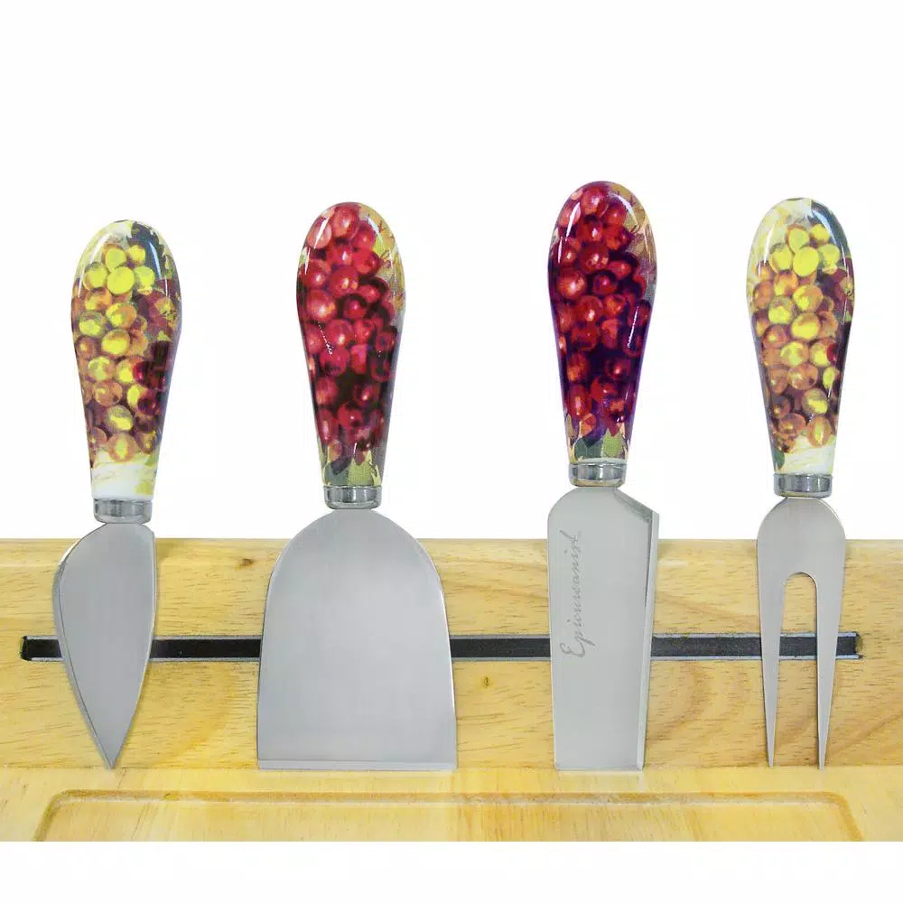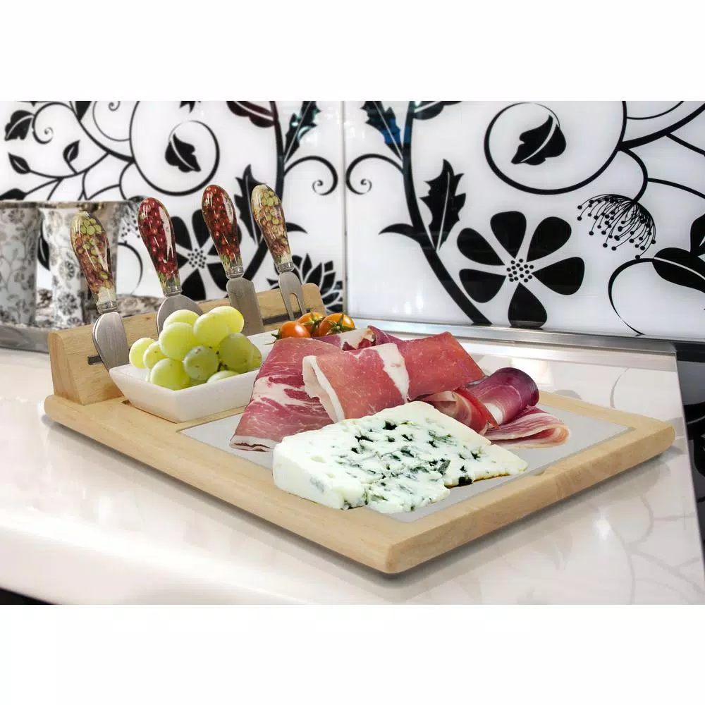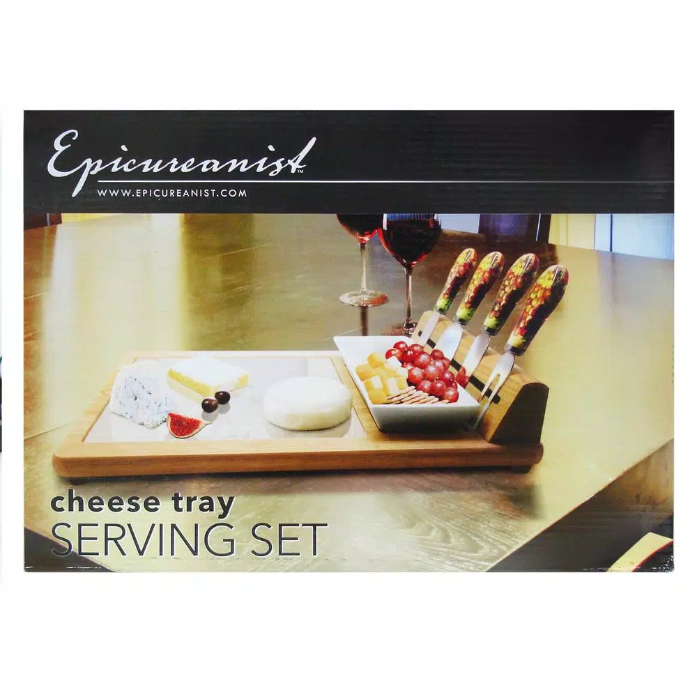 Entertain in style with this Epicureanist Cheese Tray Serving Set. The bamboo tray has a smooth glass center for placing the cheese and is equipped with a magnetic strip to hold the 3 vineyard cheese knives and 1 cheese fork. The set also includes a ceramic serving dish that makes the perfect addition to use for olives, crackers or sauces.