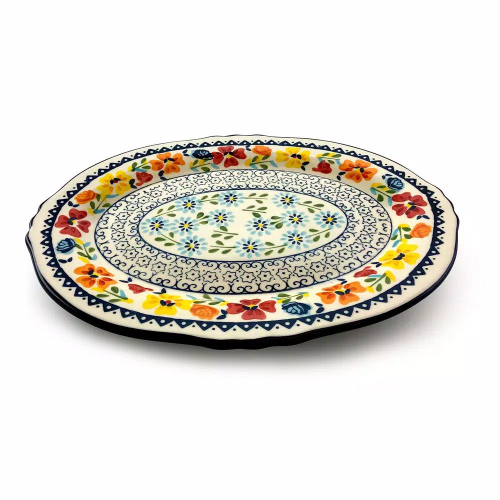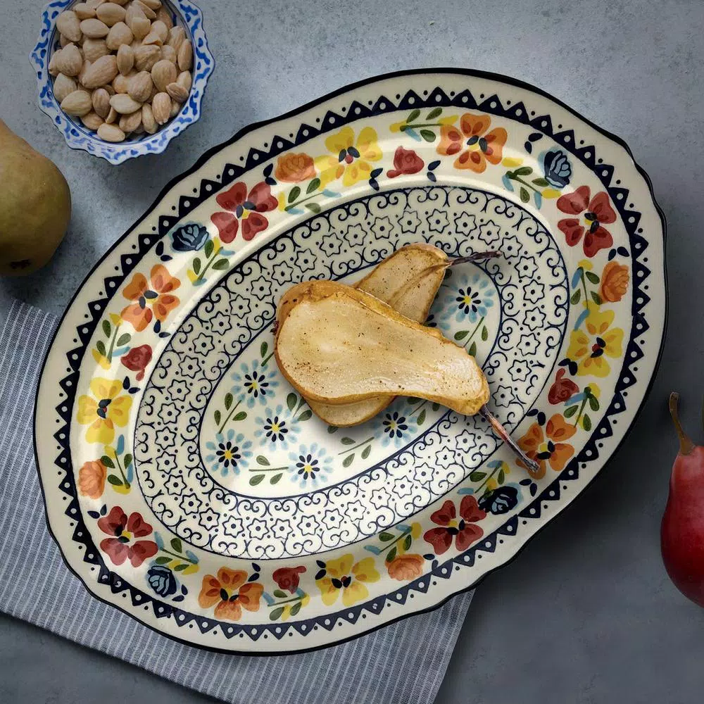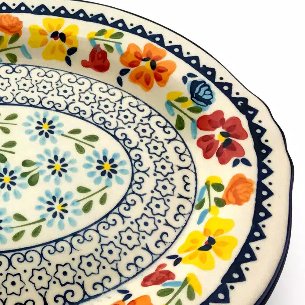 Add a pop of color to your home with the Luxembourg 14 in. Serving Platter Oval Hand Painted Stoneware. This beautifully crafted serving platter is decorated in intricate floral and lace designs, adding a touch of home to every kitchen. The 14 in. surface area makes this serving platter perfect for hosting large events or to hold your baked goods.