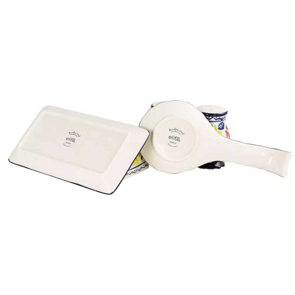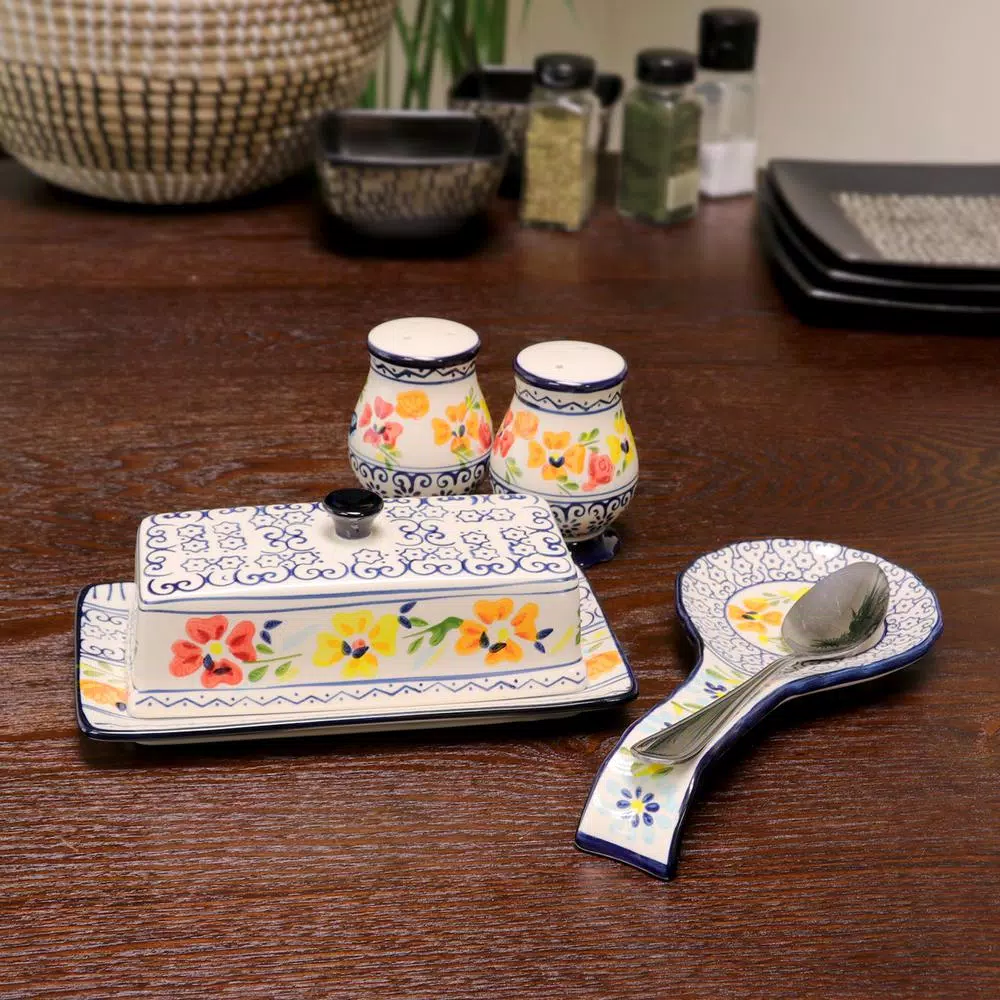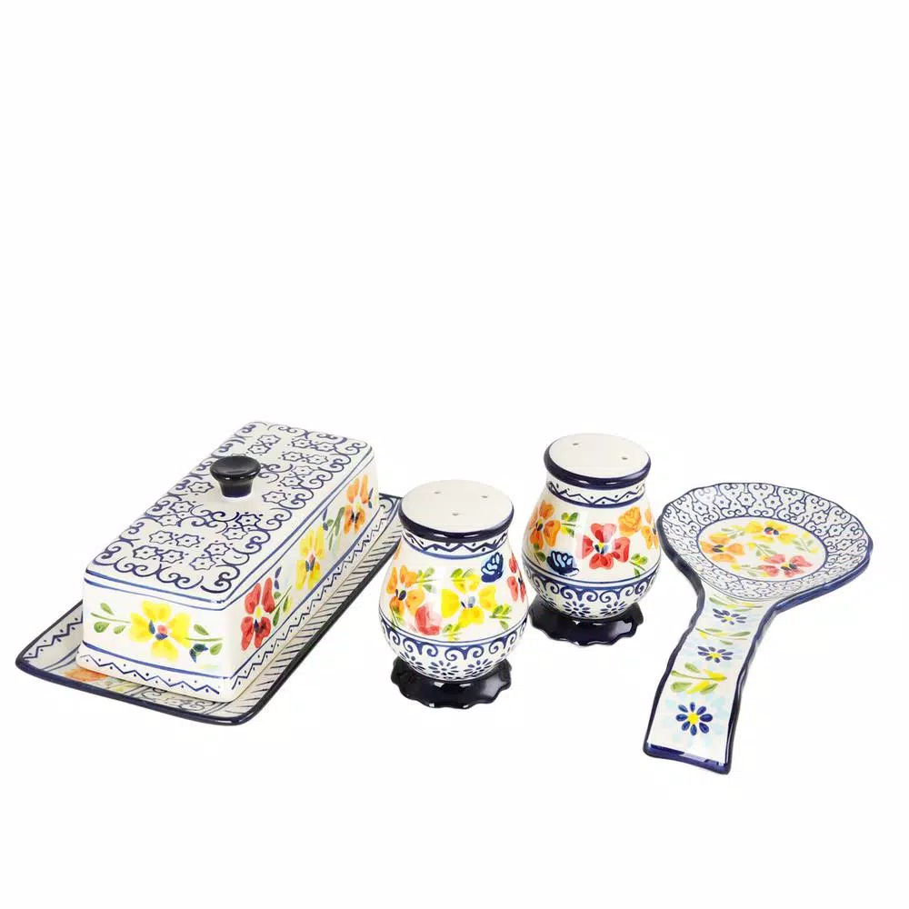 The Luxembourg 4 Piece Stoneware Serving Set from Gibson Elite will bring unprecedented beauty to your dining table. Colorful flowers dance with blue whimsical designs atop a white background, bringing a unique charm to your table setting. It features a butter dish, spoon rest and a salt and pepper need to accompany you in elegance during your meals. This delicate set features hand painted designs on a durable stoneware construction for endless style and satisfaction.