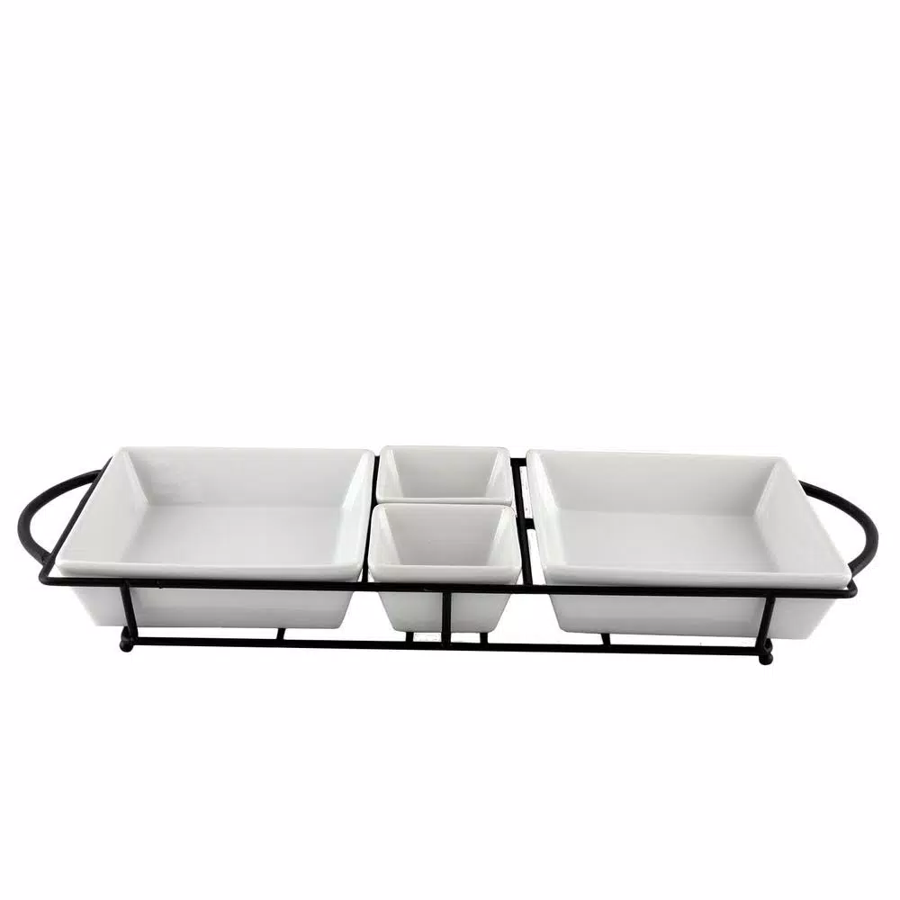 - Serving set includes 4-trays and 1-metal rack