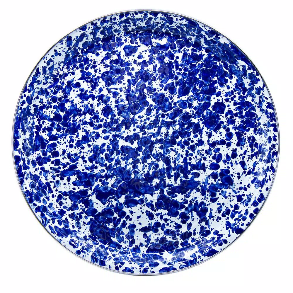 20 in. Large Tray, 2.25 in. deep. This enamelware is made of carbon steel coated with a porcelain enamel and trimmed in stainless steel. There will be variations in the shading of colors and pattern formations which are the results of the hand-dipped process.