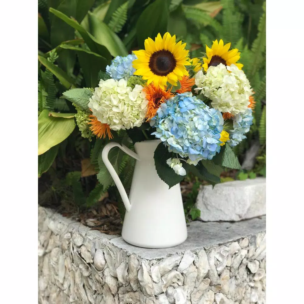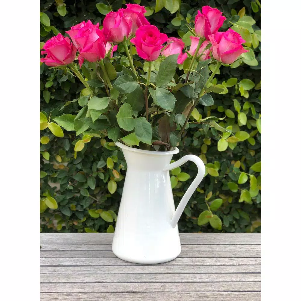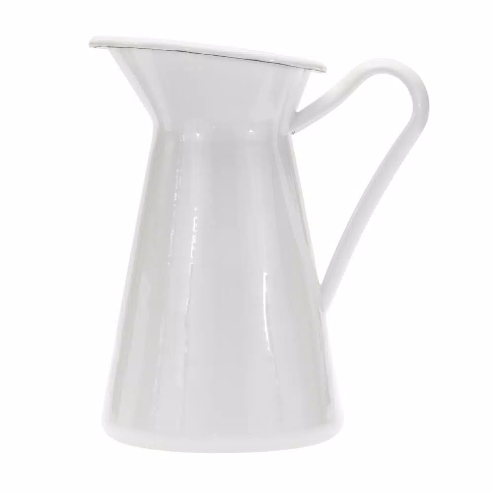 3 quart pitcher, 11.5 inch tall, 7 inch base This enamelware is made of carbon steel coated with a porcelain enamel. There will be variations in the shading of colors and pattern formations which are the results of the hand-dipped process.