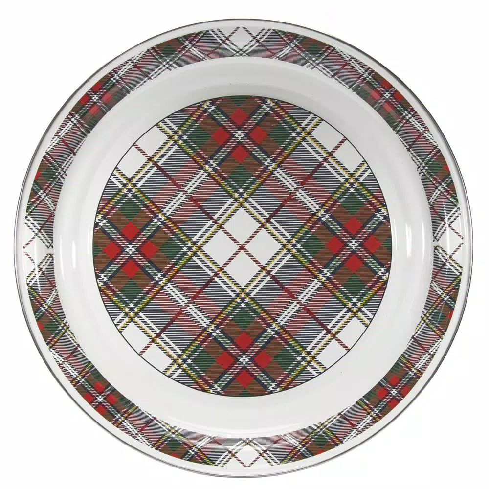 20 inch Large Tray, 2.25 inches deep This enamelware is made of carbon steel coated with a porcelain enamel and trimmed in stainless steel. There will be variations in the shading of colors and pattern formations which are the results of the hand-dipped process.