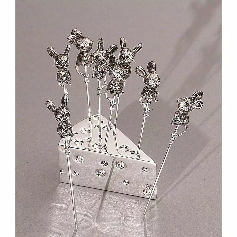This set contains 8 pcs silver mouse cheese picks with crystal. Made of silver plated material8 Cheese picks on cheese stand. The perfect gift. Ideal for cakes, cookies and cheese Easy care cleaning.