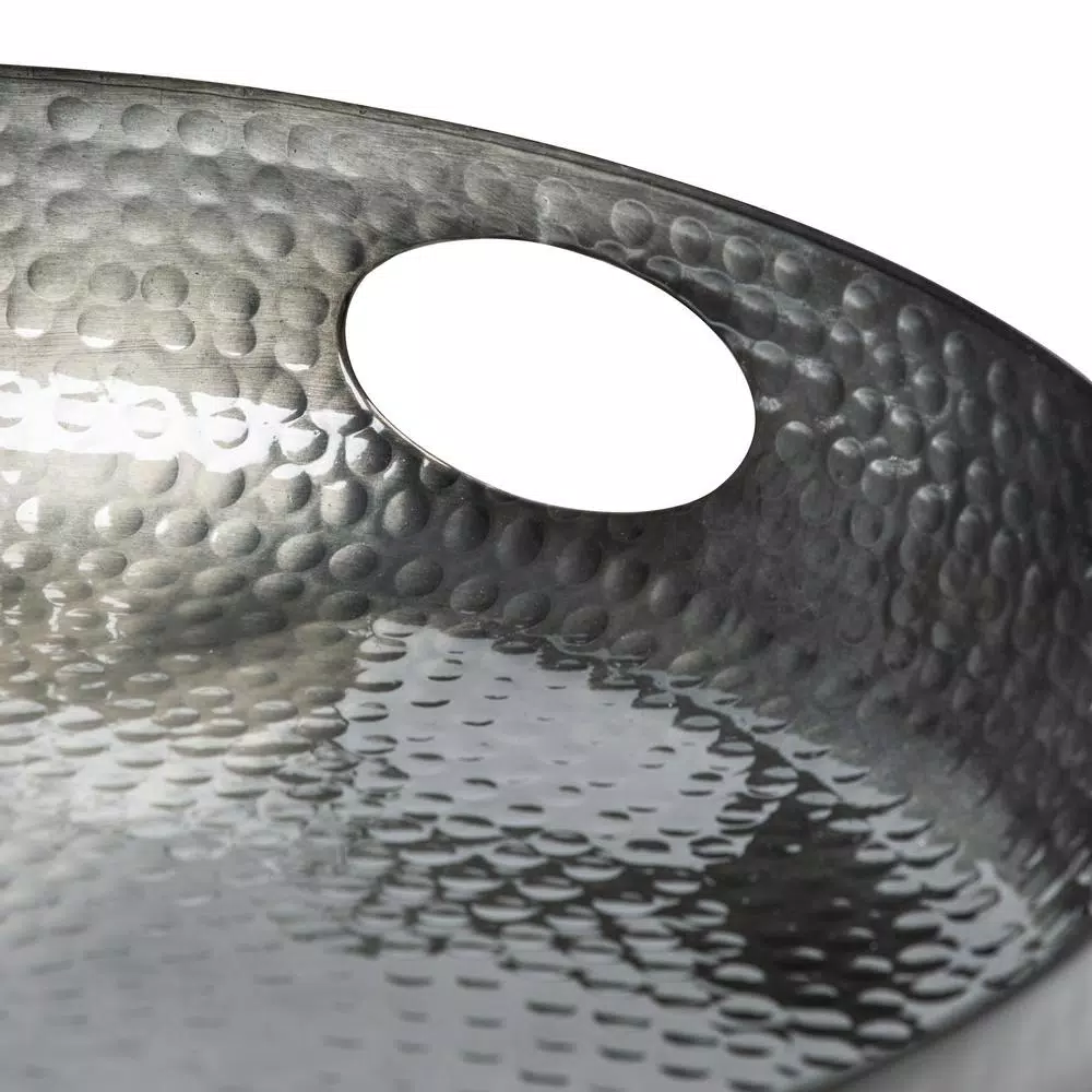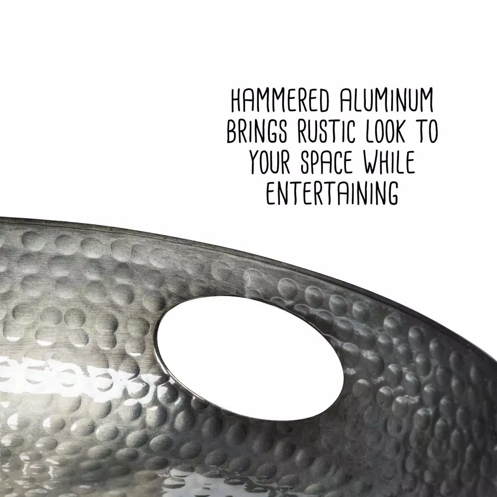 Entertain at your next dinner party with this 16 in. hammered round serving tray for serving beer, wine or snacks. The hammered aluminum will go perfect with your Saturday night best while you serve custom cocktails and the just-right apps to your guests. Handles provide easy carrying and picking up and placing down without spilling a drop.