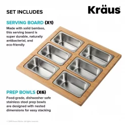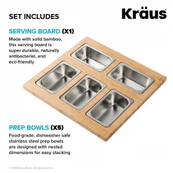 - Sink accessory set designed for use with kraus workstation sinks includes solid bamboo serving board (x1) with stainless steel prep bowls (set of 5)