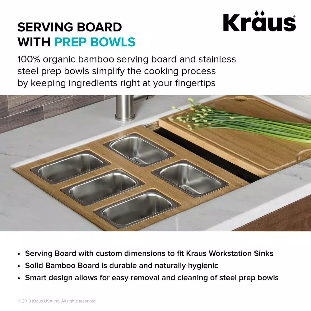 - Sink accessory set designed for use with kraus workstation sinks includes solid bamboo serving board (x1) with stainless steel colander (x1) and mixing bowl (x1)