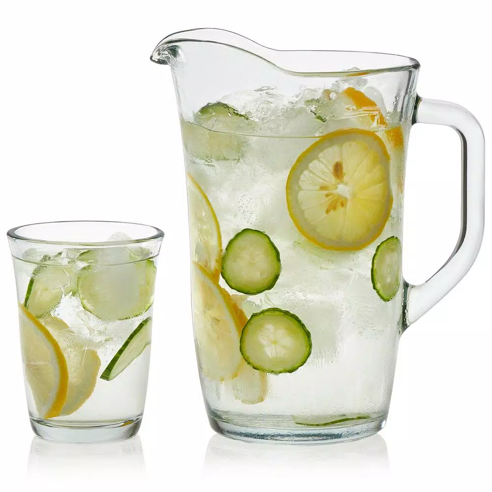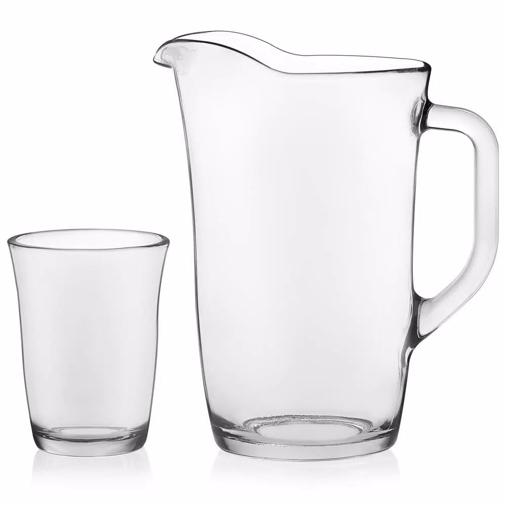 - Includes 1, 61-ounce glass pitcher (7.3-inch max diameter [including handle] by 9.1 inches high) and 4, 12-ounce glasses (3.5-inch max diameter by 4.6 inches high)