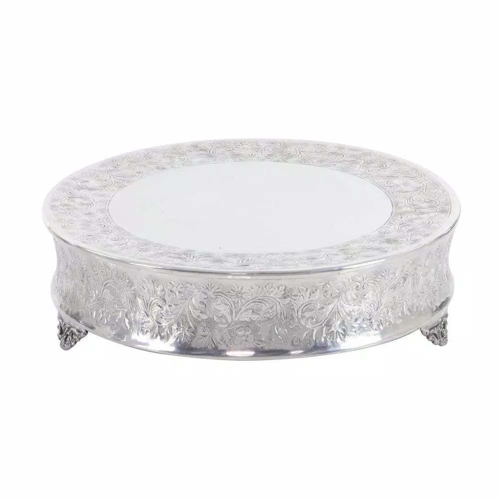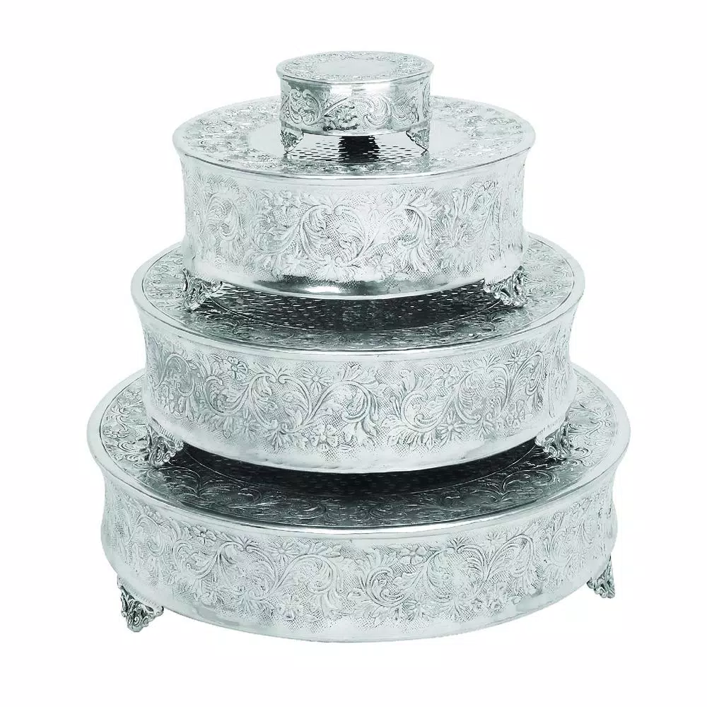Set of four 22 in. , 18 in. , 14 in. and 6 in. Entertaining round aluminum floral vine and leaf design cake stands, polished silver-finish, raised vine, leaf and floral pattern on sides and top rims, dimpled pattern center tops, ornate iron scroll feet