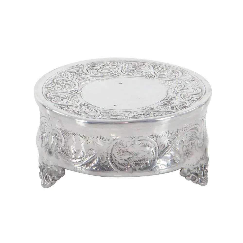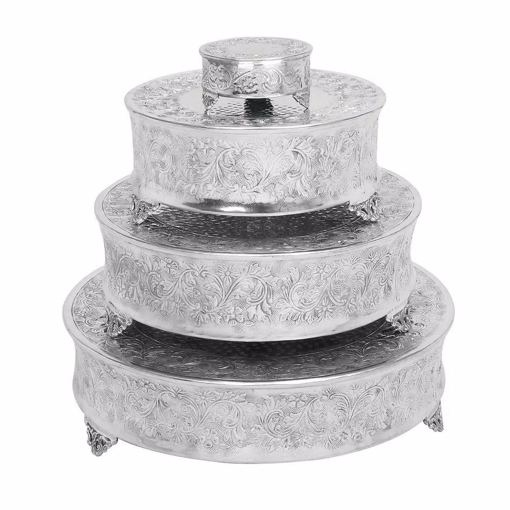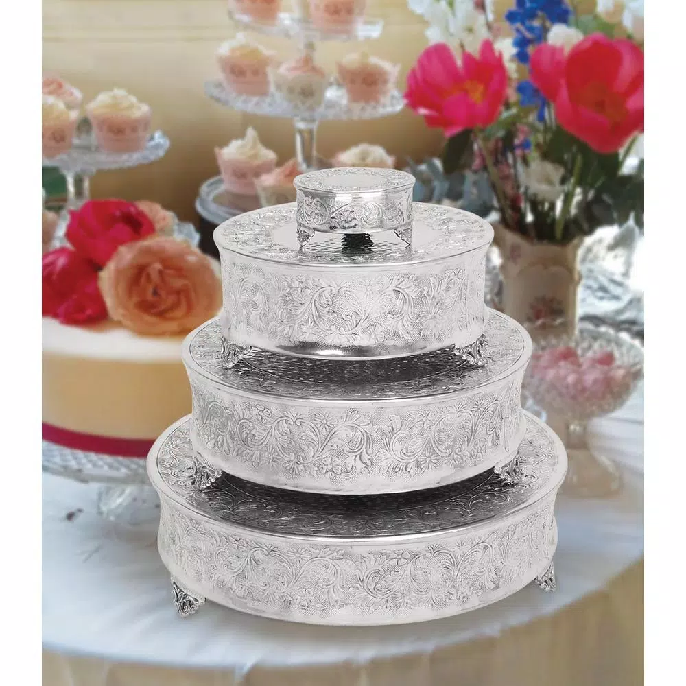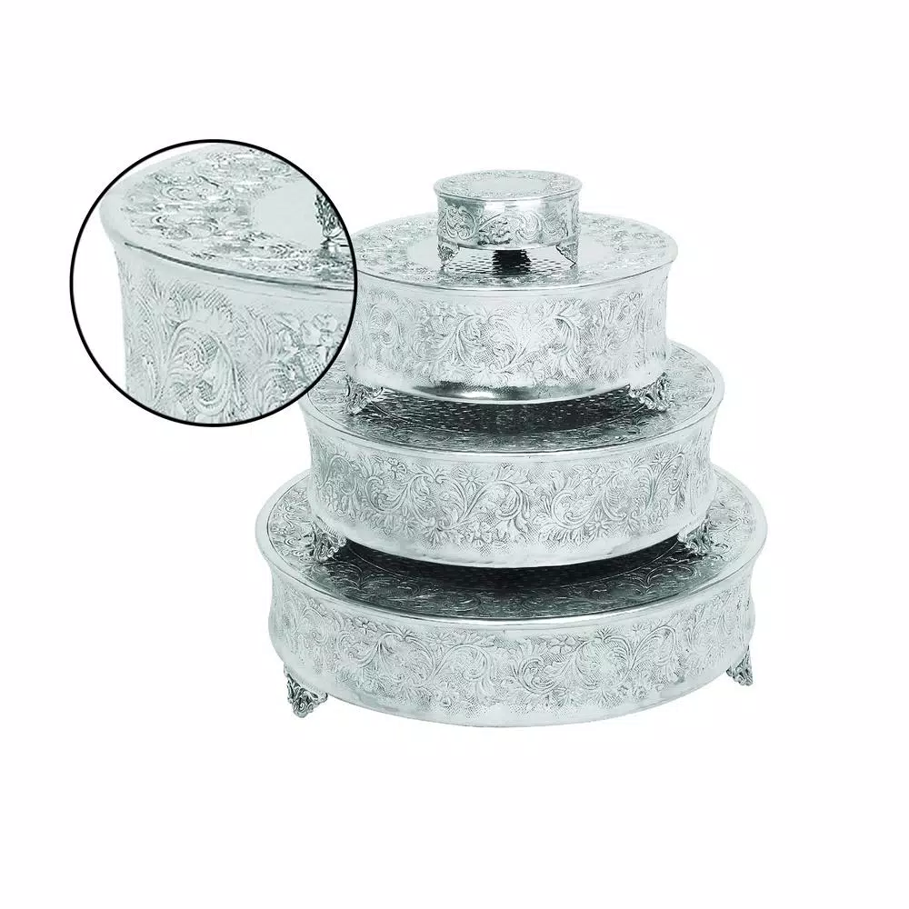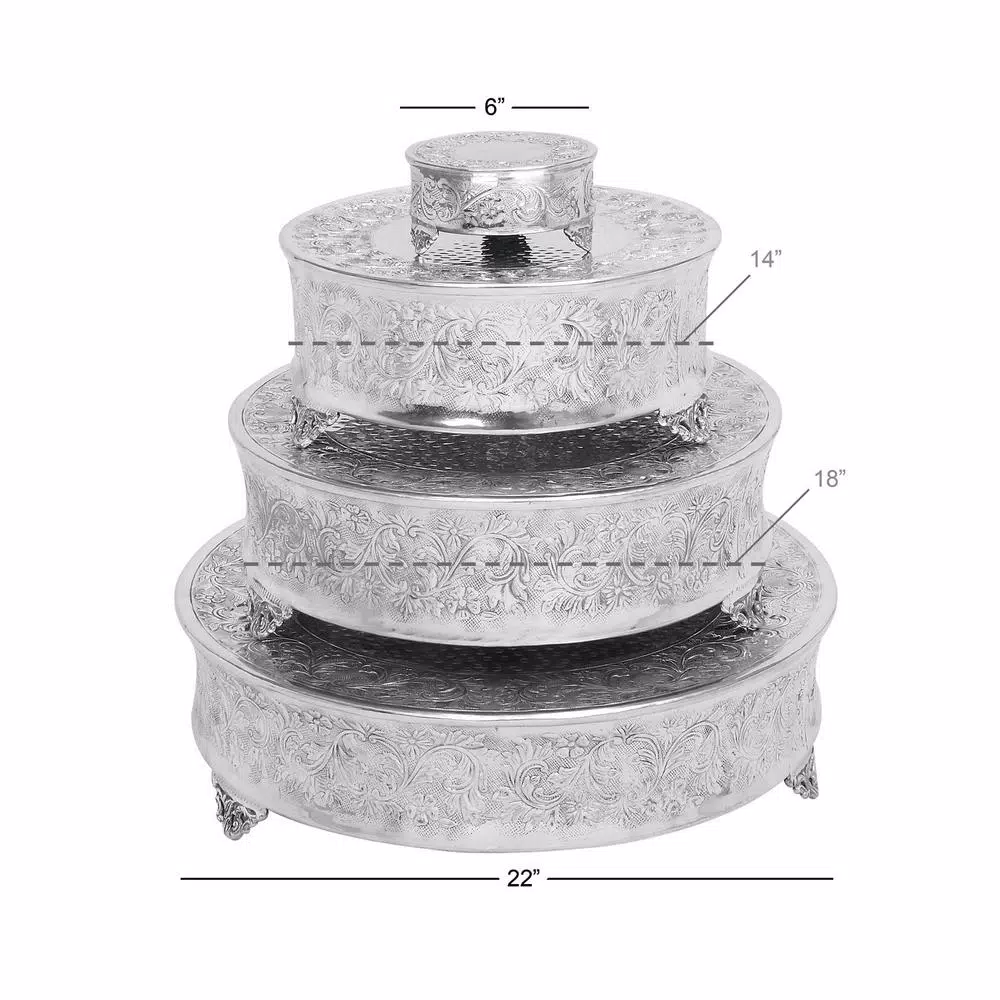 - Set of 4 traditional 6, 14, 18, and 22 inch silver aluminum round cake stands