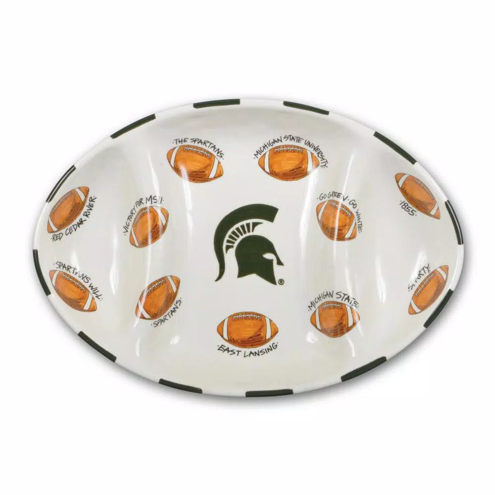 This officially licensed NCAA collegiate football serving platter will be the centerpiece of your next tailgating or game day event. The football shaped ceramic platter decorated in team colors proudly displays your teams logo in the center surrounded by footballs featuring team chants and nicknames. The platter is large enough to hold plenty of your favorite tailgate food and is divided into 3 sections making it easy to serve different items. Great for hors doeuvres, dips, wings, sandwiches, sauces, snacks, or desserts.