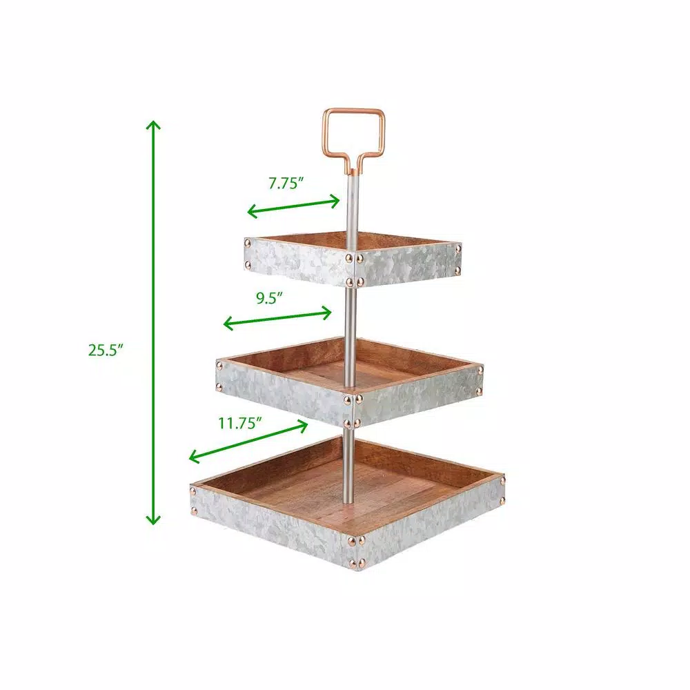 Serve dessert in style with a stunning three-tier tray from Mind Reader Products.The stacked dessert tray is a necessity among any collection of serving ware, but can generally be useful around the home as well, due to its multitude of functions. Tiered dessert trays make a convenient way to create beautiful arrangements of cupcakes, petit fours, and other pastries at a party, or as a setting for a charcuterie or hors d’oeuvres arrangement. Use the tiered tray for a decorative centerpiece on a dining room or coffee table, or to support your cosmetics on a vanity. How you use this stylish stacked serving tower is entirely up to you, but we can guarantee you’ll want it among your collection. The eye-catching craftsmanship of this unique serving tray from Mind Reader Products makes it the conversation centerpiece of any occasion. Its gorgeous steel-plated wood construction makes an alluring accent wherever and however it’s used. It boasts a comfortable weight capacity of 5.5 lbs., and the built-in handle makes it a breeze to offer petit fours with coffee service, display dessert on the table, or transfer a spread of scrumptious snacks to your friends or family. The unit can be easily cleaned with a gentle soap and water solution and a soft, damp cloth. Display your desserts delightfully with a triple-tier serving stand from Mind Reader Products.
