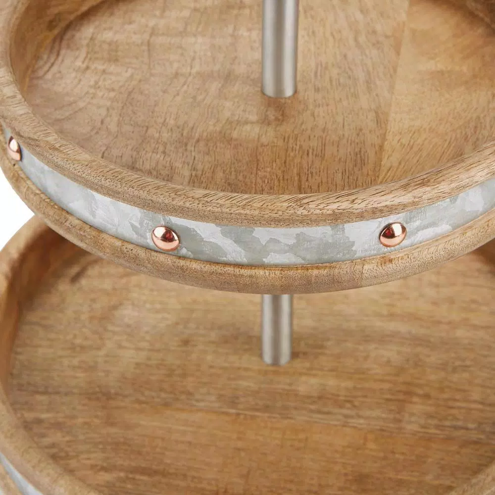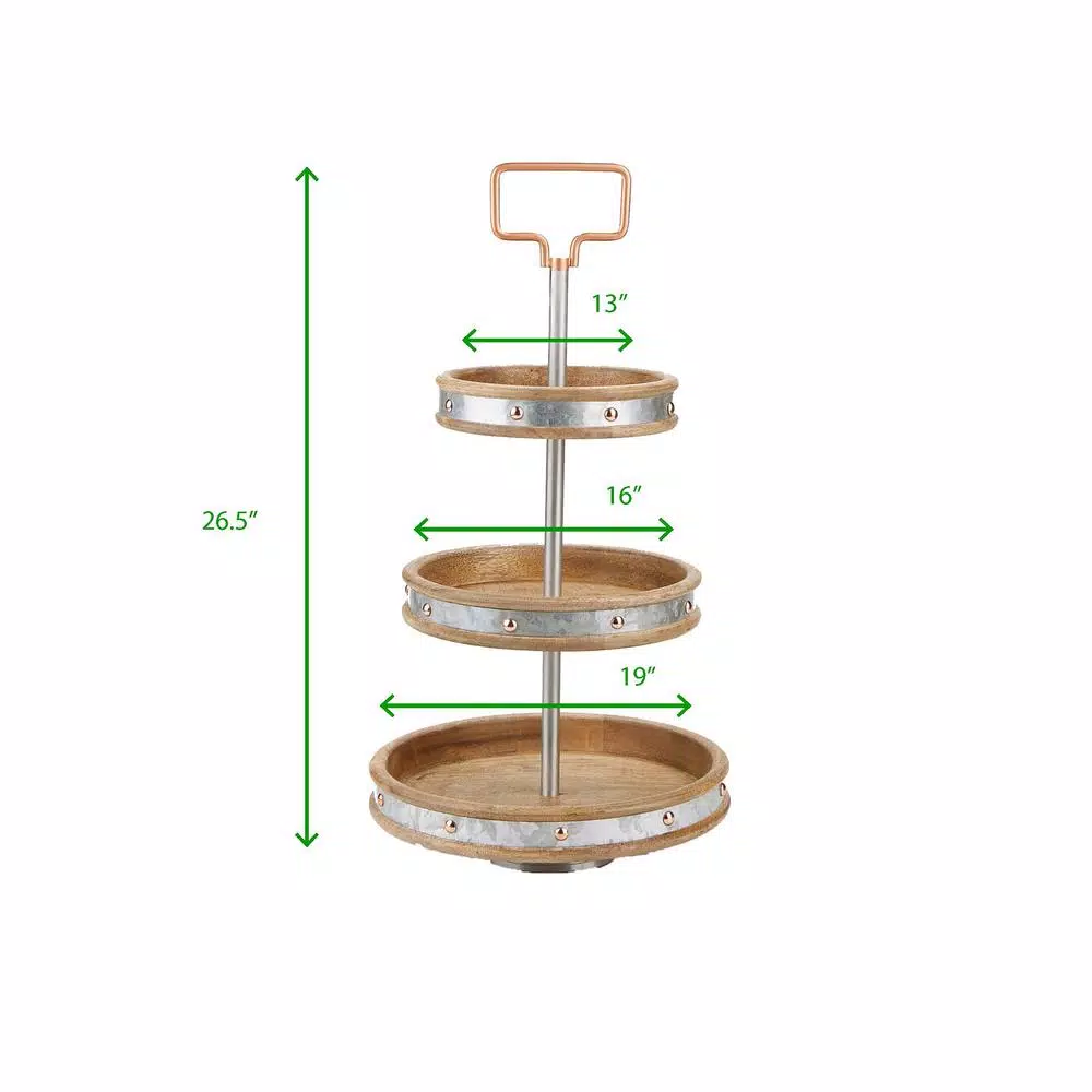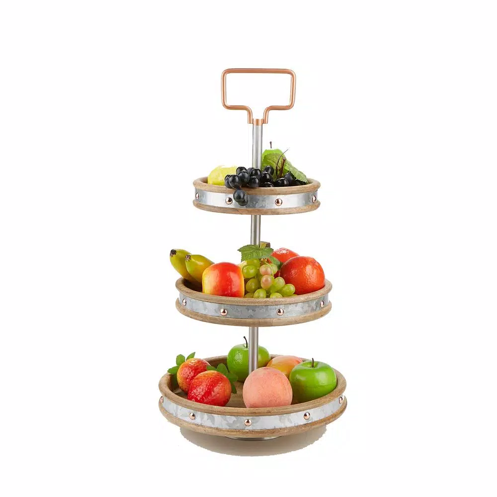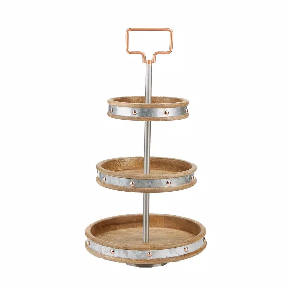Display your desserts delightfully with a triple-tier serving stand from Mind Reader Products. Use the tiered tray for a decorative centerpiece on a dining room or coffee table, or to support your cosmetics on a vanity. The eye-catching craftsmanship of this unique serving tray from Mind Reader Products makes it the conversation centerpiece of any occasion. Its gorgeous steel-plated wood construction makes an alluring accent wherever and however itโs used. It boasts a comfortable weight capacity of 6 lbs, and the built-in handle makes it a breeze to offer petit fours with coffee service, display dessert on the table, or transfer a spread of scrumptious snacks to your friends or family. The unit can be easily cleaned with a gentle soap and water solution and a soft, damp cloth.