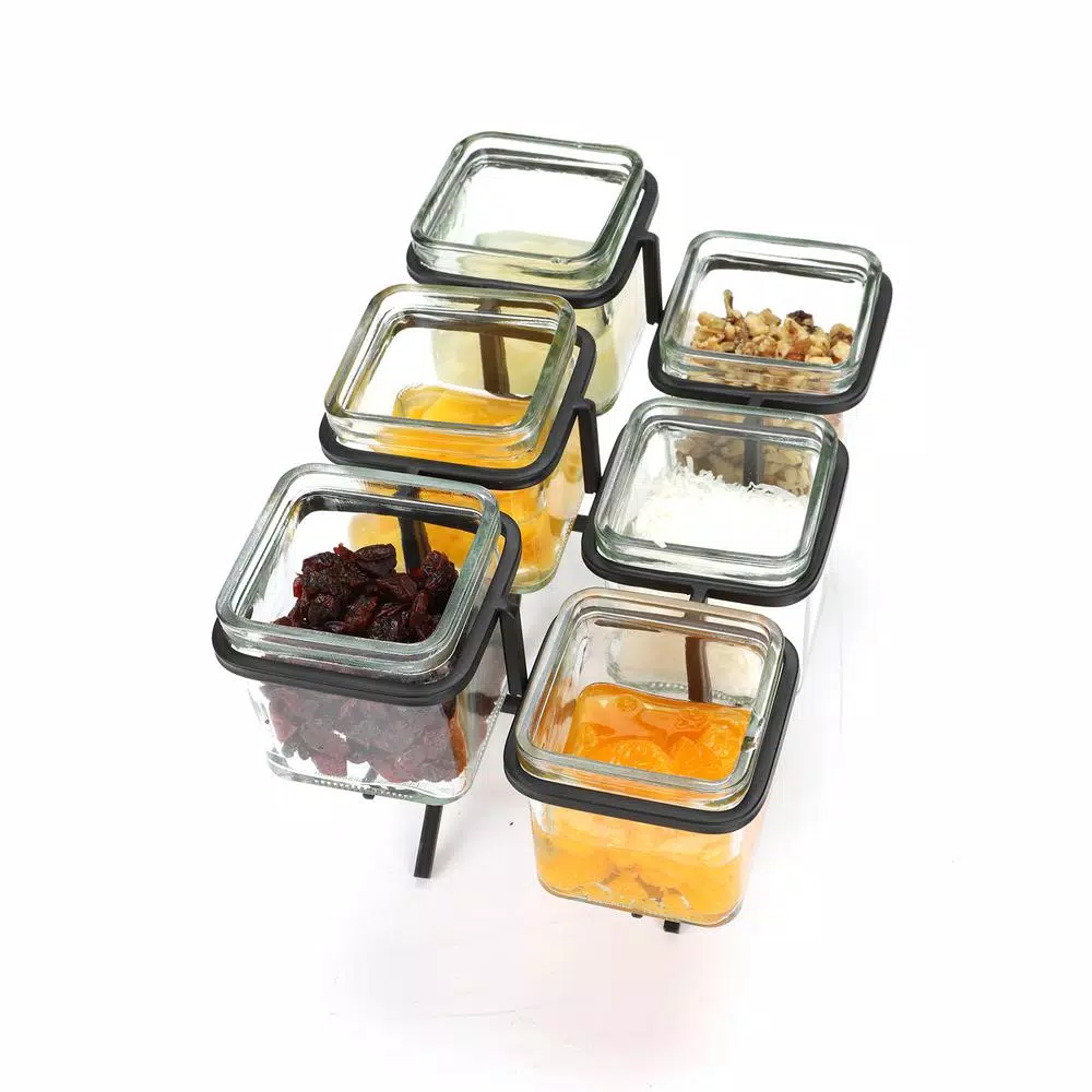 - 2 tiers – of condiment jar rows, 3 jars in each row for a total of 6 clear jars for organizing all types of condiments, foods, desserts, and more, sturdy metal support ensures your delicious condiments or supplies will not tip over and make a mess