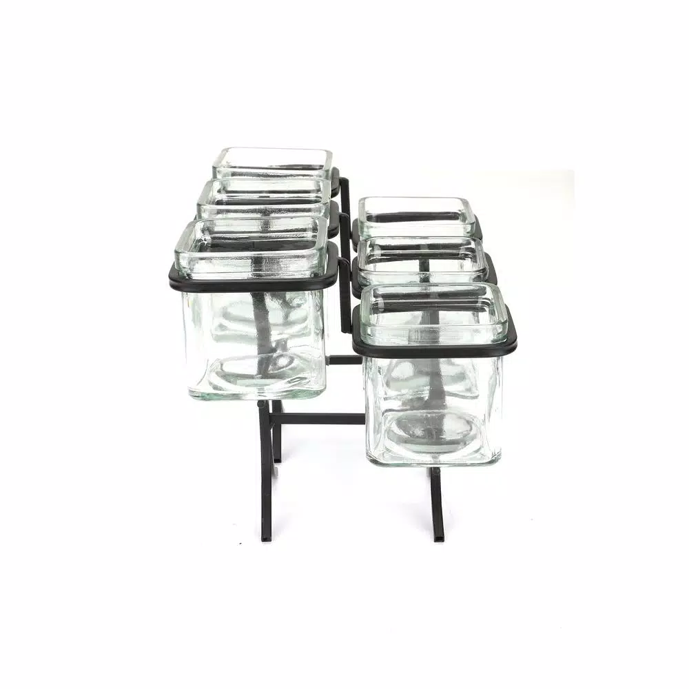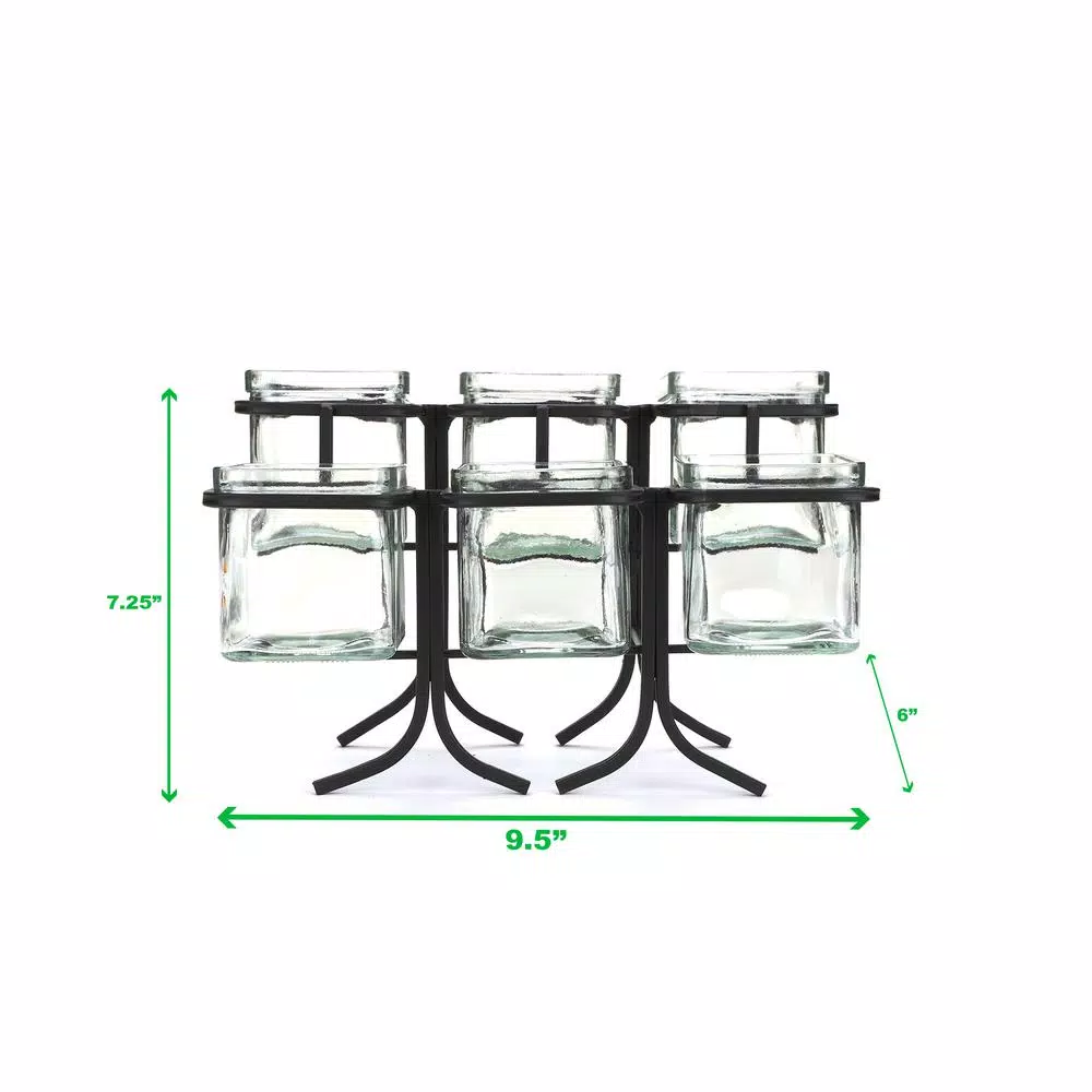 Serve up an elegant array of condiments in this table-top rack from Mind Reader Products. Sitting down to a dinner with family or friends should mean that you get to relax and enjoy your meal, not pop up every ten minutes to get salt, pepper, ketchup, or mustard for someone at the table. Using a condiment rack allows you to offer an array of toppings and seasonings for your guests, whether you’re creating a sundae bar, salad station, or simply having a regular meal. Fill up the glass jars with your desired contents, then arrange them inside the rack to serve up to six different condiments and toppings at a time, or buy multiple racks and create the condiment station of your dreams. Each of the three-inch square glass jars provided with the rack can hold up to eight ounces of your favorite dips, toppings, condiments, or other supplies. Stacked in a multi-level display of three jars in two rows for improved balance and sturdiness, the condiment jars arranged in this holder make an upscale, functional addition to your dining experience. Fill it with sprinkles, candy, gummy bears, etc. for a sundae bar; with ketchup, mustard, relish, and other toppings for a hot dog station; or with maraschino cherries and other bartending essentials for stylish bar service. You can even fill the sections with dip and use it with a veggie or cracker platter, or to arrange beauty and crafting supplies.