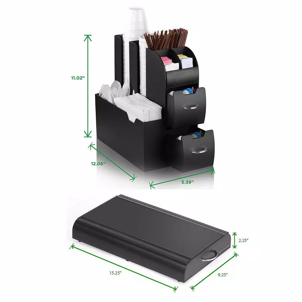 - ULTIMATE OFFICE COFFEE & CONDIMENT ORGANIZER SET: All in one 10-compartment, 3 tiered with 2 drawers condiment and snack organizer AND Nespresso Capsule organizer must-have for any office coffee service area โ holds 50 Nespresso capsules.