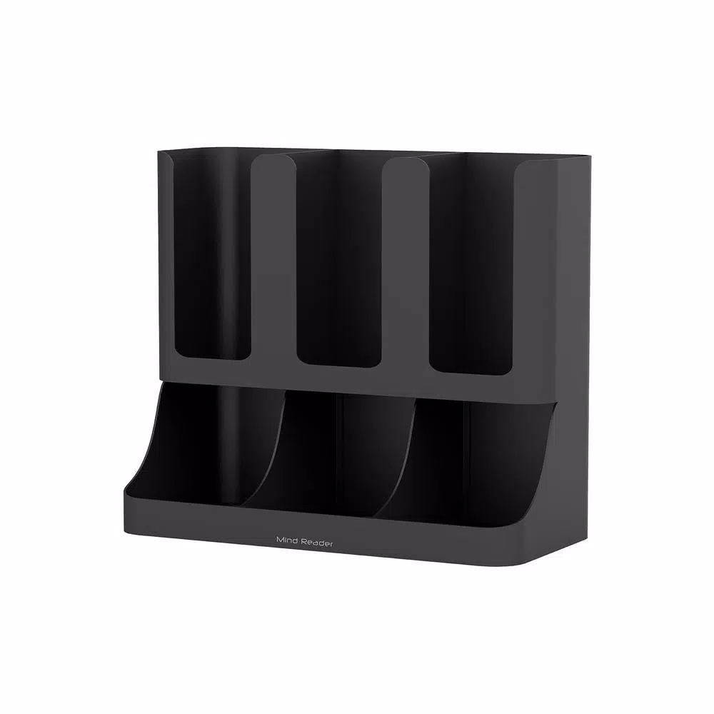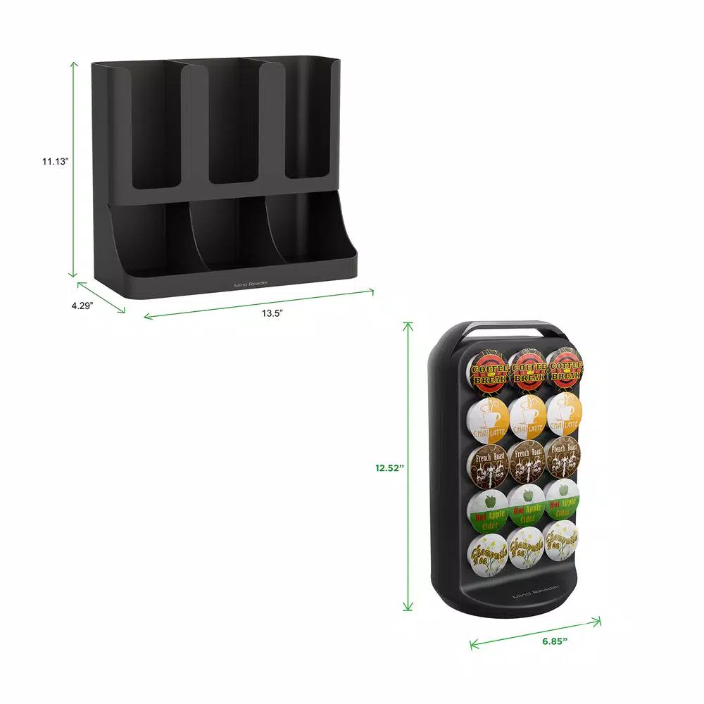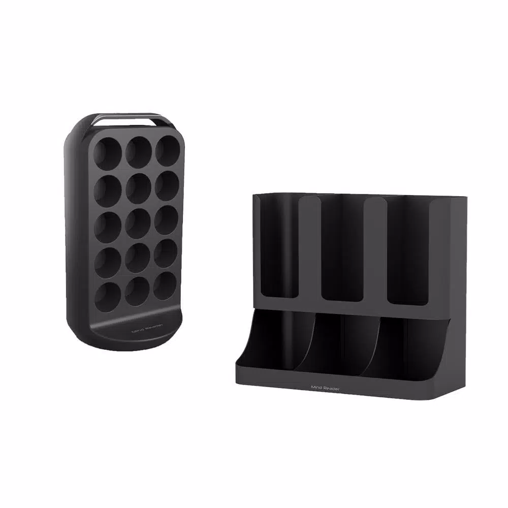 Keep coffee stations and beverage areas neat, organized, and well-stocked with all items in one compact place with this ultimate Mind Reader 2-piece coffee condiments organizer set! Organize and store your coffee and coffee condiments in one place with the Mind Reader 2-piece coffee condiments organizer set. It’s perfect for kitchens, breakrooms, beverage stations, reception areas, and more! TALL, SLENDER CAROUSEL FOR COFFEE PODS The tall and slim coffee pod carousel holds up to 30 coffee pods. Keep your favorite coffee flavors organized and within easy reach with this vertical storage carousel. The compact design saves valuable counter space.6-SECTION COFFEE CONDIMENTS AND CUPS CADDY The coffee condiments and cups organizer features 6 open sections and offers plenty of space for storing creamers, sugar packets, stirrers, coffee cups, lids, utensils, napkins, snacks, and more! SPACE-SAVING DESIGN Both pieces of this set are compact and offer plenty of space to store coffee essentials. Use this set to maximize storage space on your countertop and help to keep it neat, organized, and tidy. COFFEE POD CAROUSEL SPINS 360 DEGREES The coffee pod carousel spins 360 degrees and offers quick and easy access to your favorite coffee flavors on both sides.