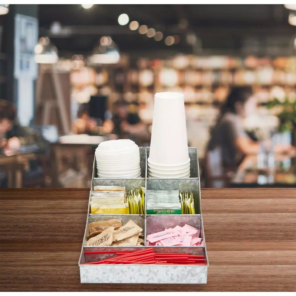 - MULTI-SLOT NON-SLIP CONSTRUCTION: Caddy features 7 compartments for beverage condiments including creamers, sugar, ketchup/mustard packets and salt/pepper packets โ stack disposable cups in the back two cubbies with ease โ easy to refill.