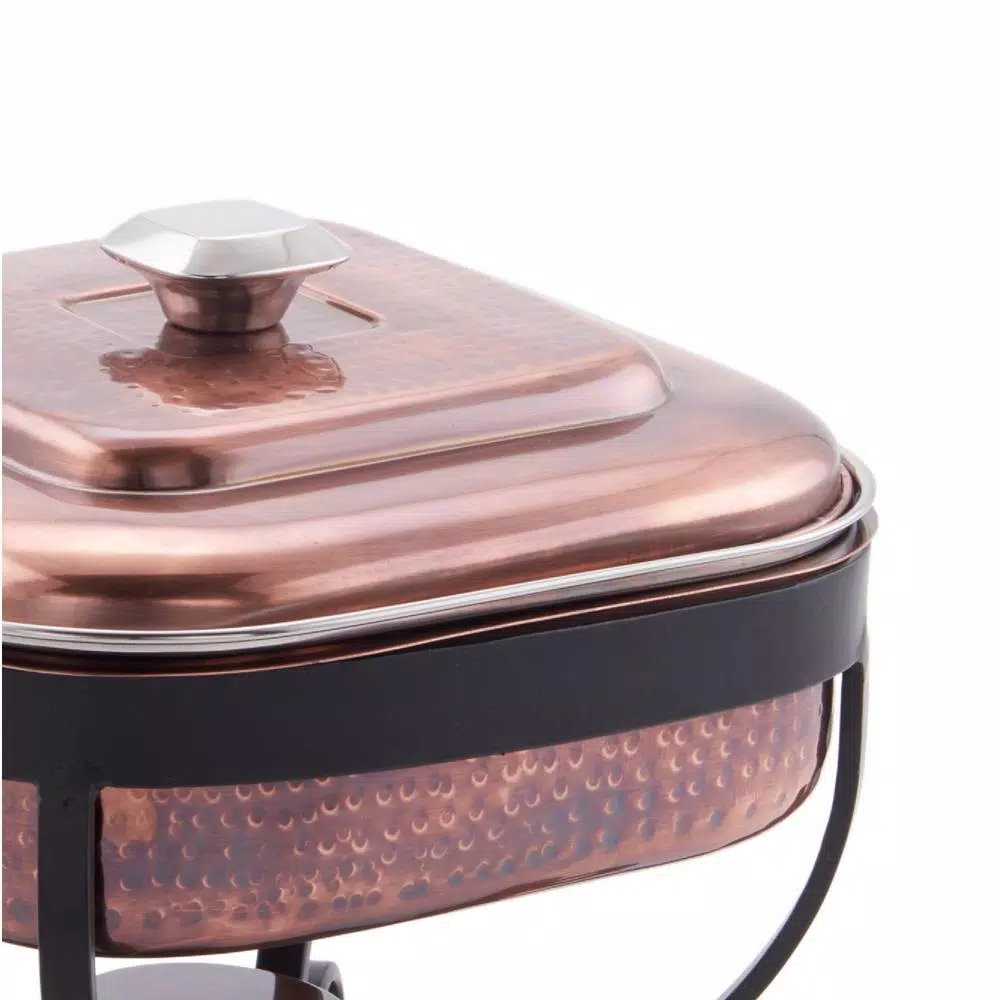 3 Qt. Square Hammered Antique Copper Chafing Dish with Stainless Steel Spoon. 3 Qt. Stainless Steel food pan is oven safe to 350Β°F, water-bath design keeps food at the perfect serving temperature without drying out. Includes Sturdy Iron stand. Adjustable fuel holder takes standard βSternoβ type gel fuel canisters (not included).