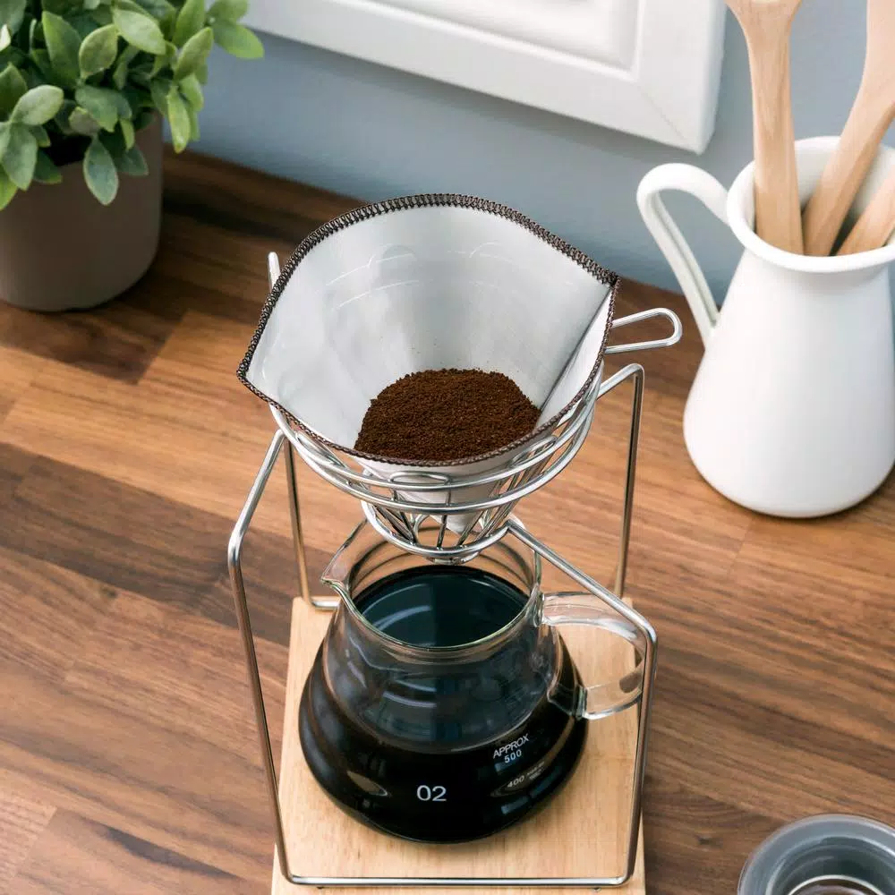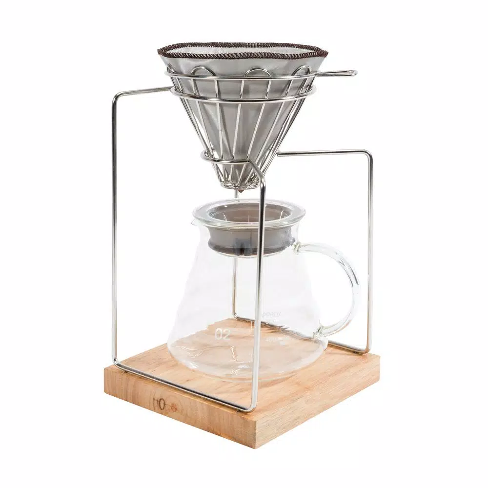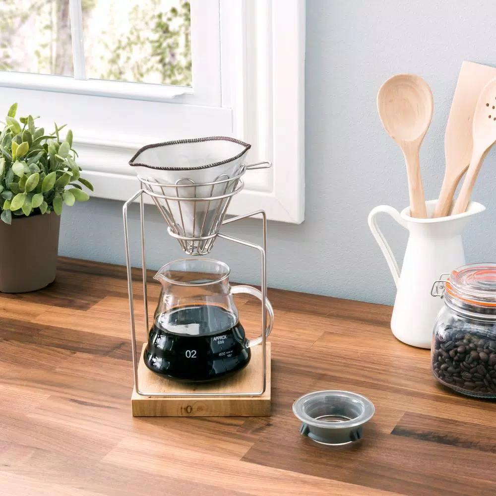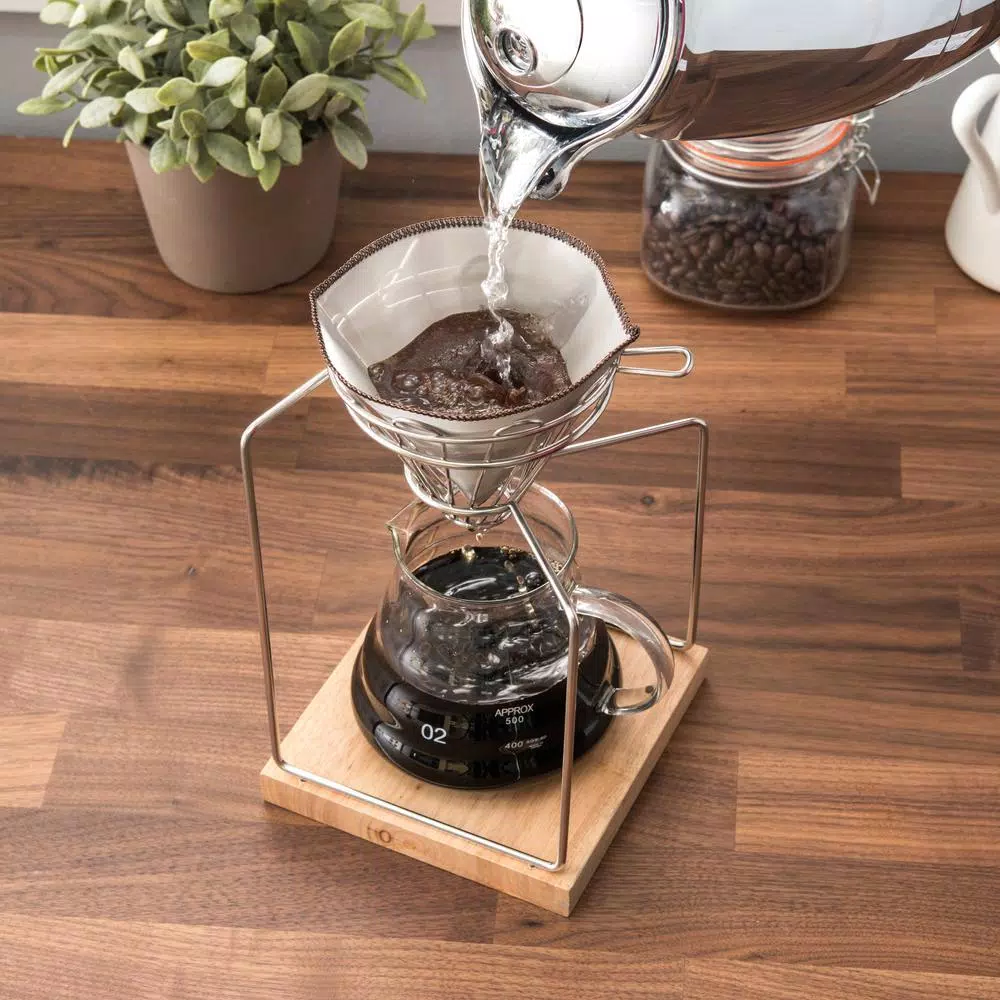 Brew great pour over coffee with this stylish set. Pour over coffee accentuates the flavor for a better tasting cup of coffee, filtering the extracted oils and extracting the fragrance. Unlike the coffee press method which completely immerses the coffee, pour over coffee does not saturate the coffee with water. The stainless steel mesh filter is reusable, dishwasher safe and eliminates any undesirable taste common associated with paper filters. Includes: wire rack and rubberwood base, stainless steel wire cone dripper, stainless steel mesh filter, 20 oz. glass carafe and silicone lid. All components except wire rack are dishwasher safe for easy clean up. Includes brewing directions and tips for the perfect cup.