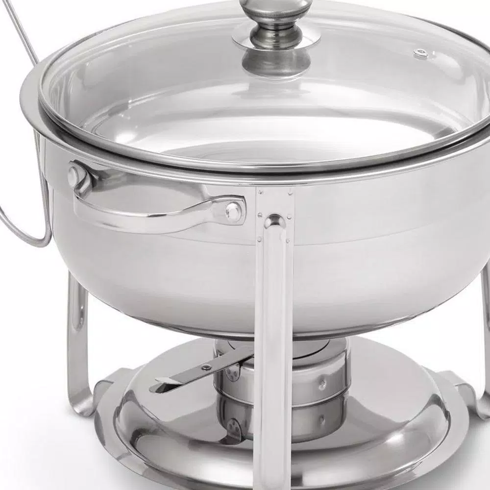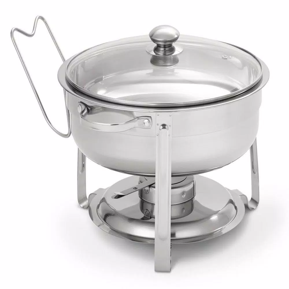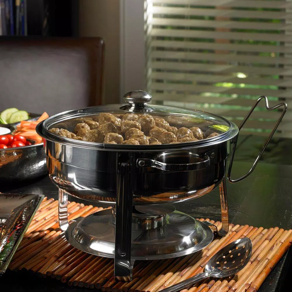 The Gibson Home Langston 6 piece 4.5 Quart Round Chafing Dish Set maintains proper food temperature for the best cuisine. Place your heat source in the fuel holder, and place your food in the upper pan. Made with stainless steel for superior strength and corrosion resistance, this chafer keeps food warm with a large pan and transparent lid with a steam release vent. Hand wash with hot, soapy water and rinse thoroughly to clean. Dry immediately after washing. Avoid salt solutions or acidic foods and abrasive or harsh cleansers to preserve your piece’s finish. Whether you are preparing small snacks, big meals and everything in between, great meals start with Gibson Home. Made from stainless steel, this chafer is perfect for serving hot foods. The set is perfect for serving direct to the table. The stainless steel pot will distribute the heat evenly, and will keep the food hot longer