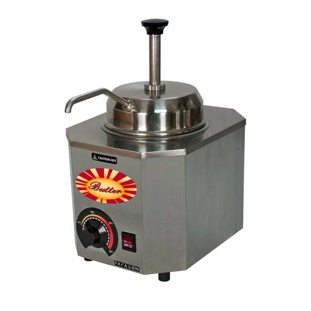 The Pro-Deluxe warmer dispenses directly from a #10 can or the optional stainless steel insert jar (part # 598120). Heat and serve delicious melted butter for your freshly popped popcorn with this Paragon butter warmer with butter pump. Commercial butter pump is included for easy serving, and the temperature is easy to modulate thanks to its adjustable thermostat. Features a stainless steel body, lighted master ON/OFF toggle switch and it uses a 500-Watt band element with an adjustable thermostat to keep your toppings at perfect temperature all day long.