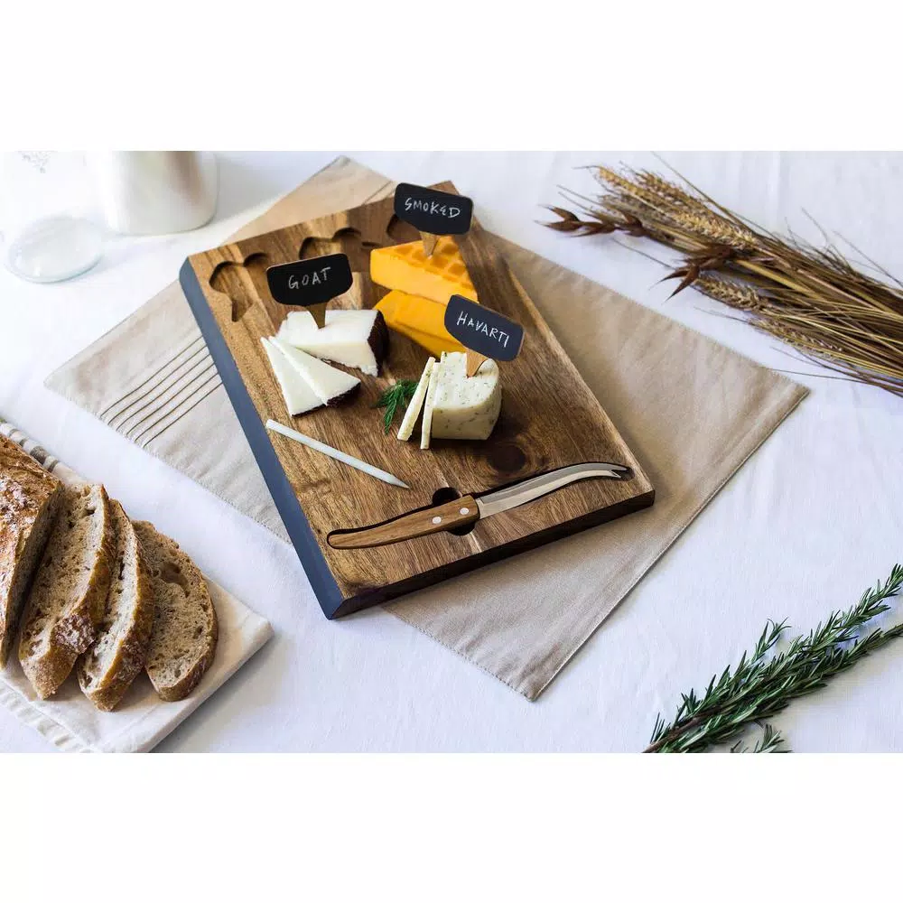 The Delio – Acacia is a two-toned bamboo cutting board that conveniently holds a cheese knife and three acacia cheese markers, freeing you from having to recite your cheese offering as each guest arrives, and leaving you with more time to mingle. One soapstone pencil is included so you can personalize your markers with each use. As an added bonus, the front chalkboard panel of the board serves as a way to personalize any occasion!
