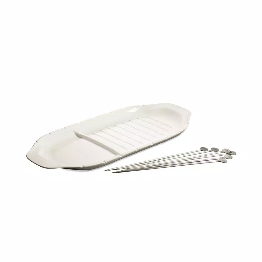 The XL Kebab Platter presents all your BBQ and grilled masterpieces in style. This 20-1/2 in. x 8-1/2 in. porcelain platter has notched sides to securely hold up to 8-skewers (not included) while transporting from grill to table. No need to worry about kebabs rolling away. To retain the texture of perfectly cooked meats, drainage grooves in the bottom of the platter raise meats above juices. There is also a separate compartment to showcase additional gourmet selections if desired. Made in Germany, this beautiful and highly functional premium porcelain platter is dishwasher and microwave safe.